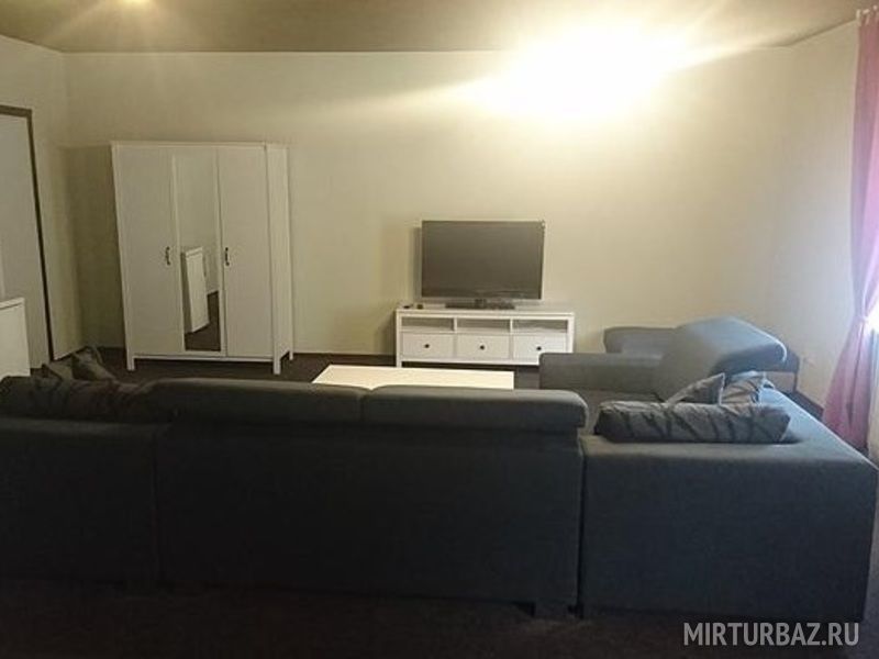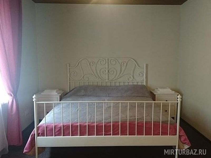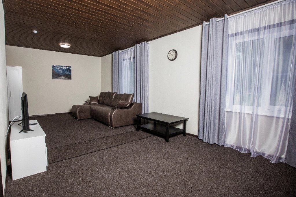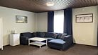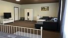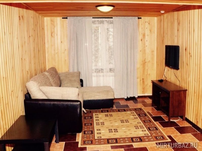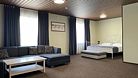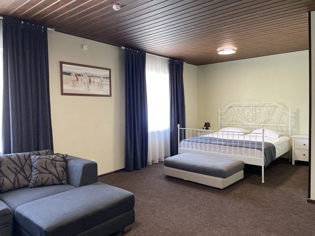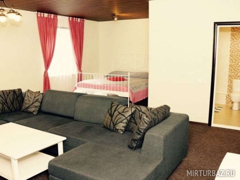 Просторный номер-студия площадью 46 м2 на четырех человек. Большая туалетная комната с душем. Большая двуспальная кровать, диван с журнальным столиком, раскладушка, телевизор.