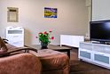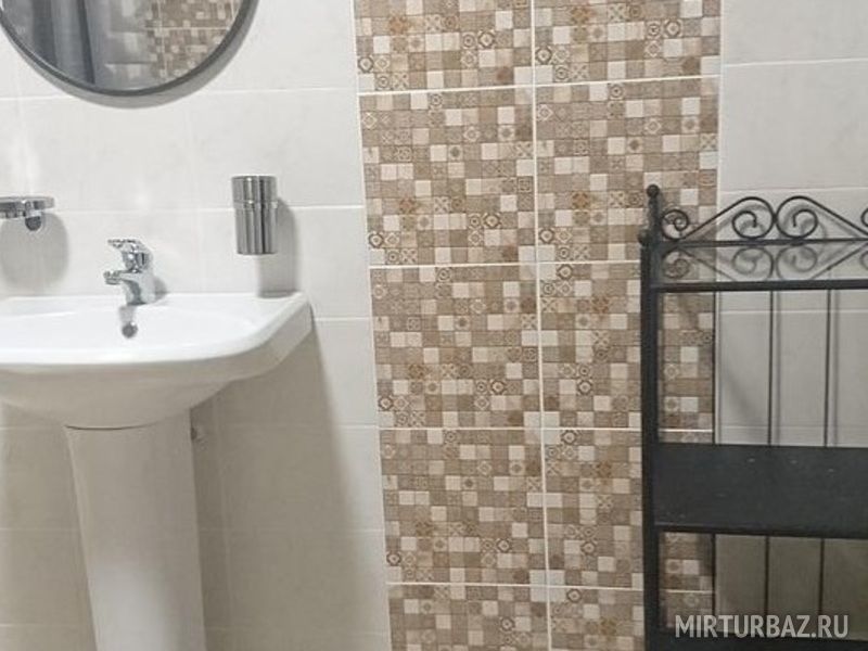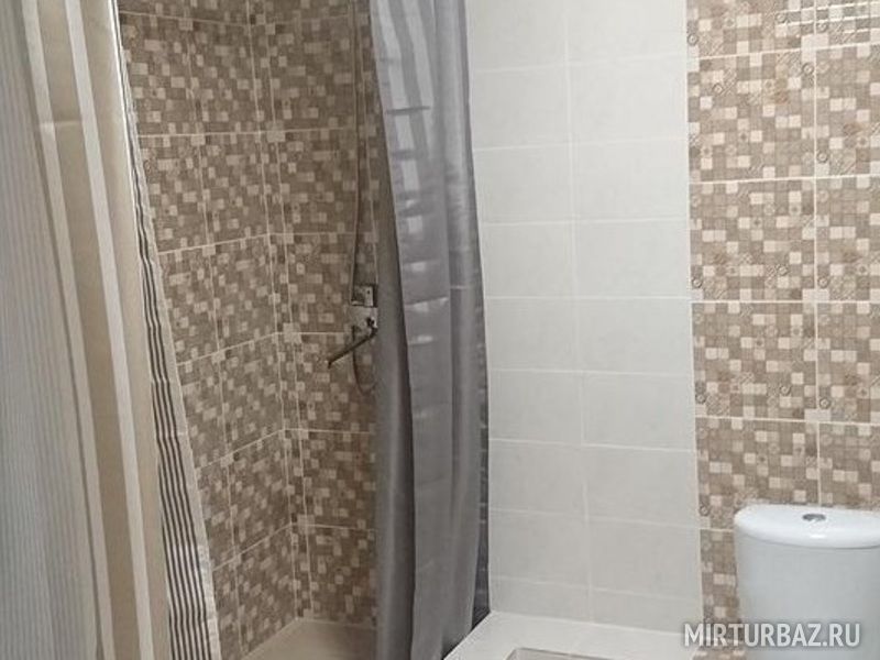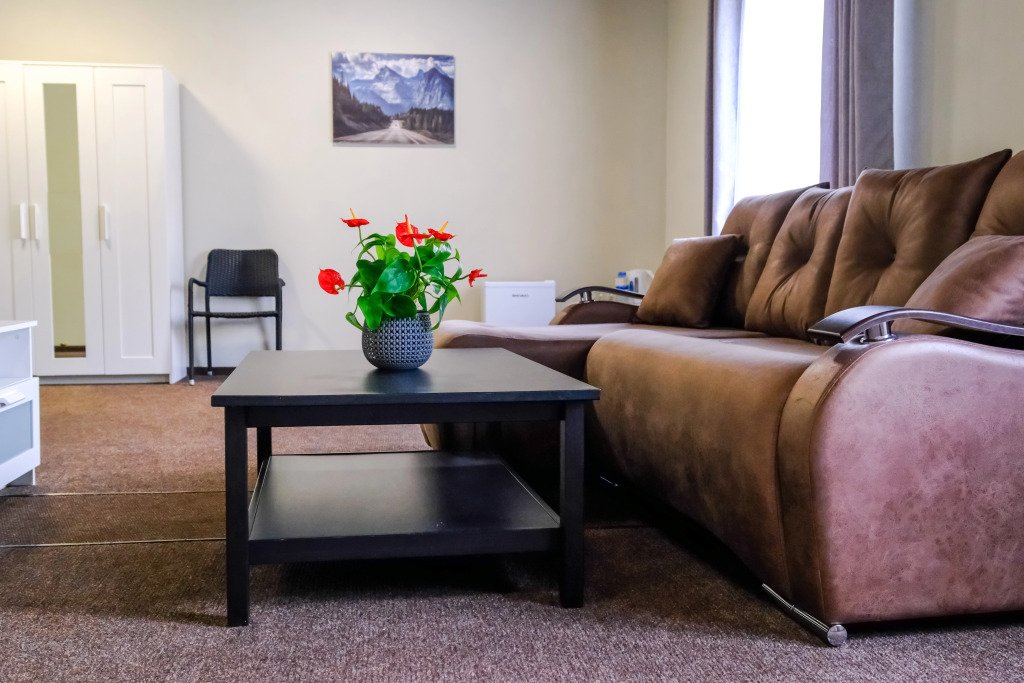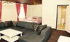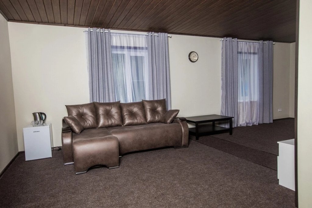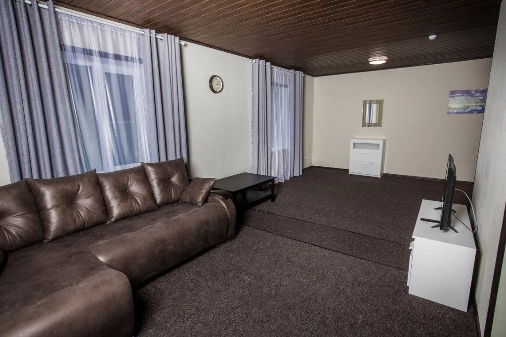 Просторный номер-студия площадью 46 м2 на четырех человек. Большая туалетная комната с душем. Большая двуспальная кровать, диван с журнальным столиком, раскладушка, телевизор.