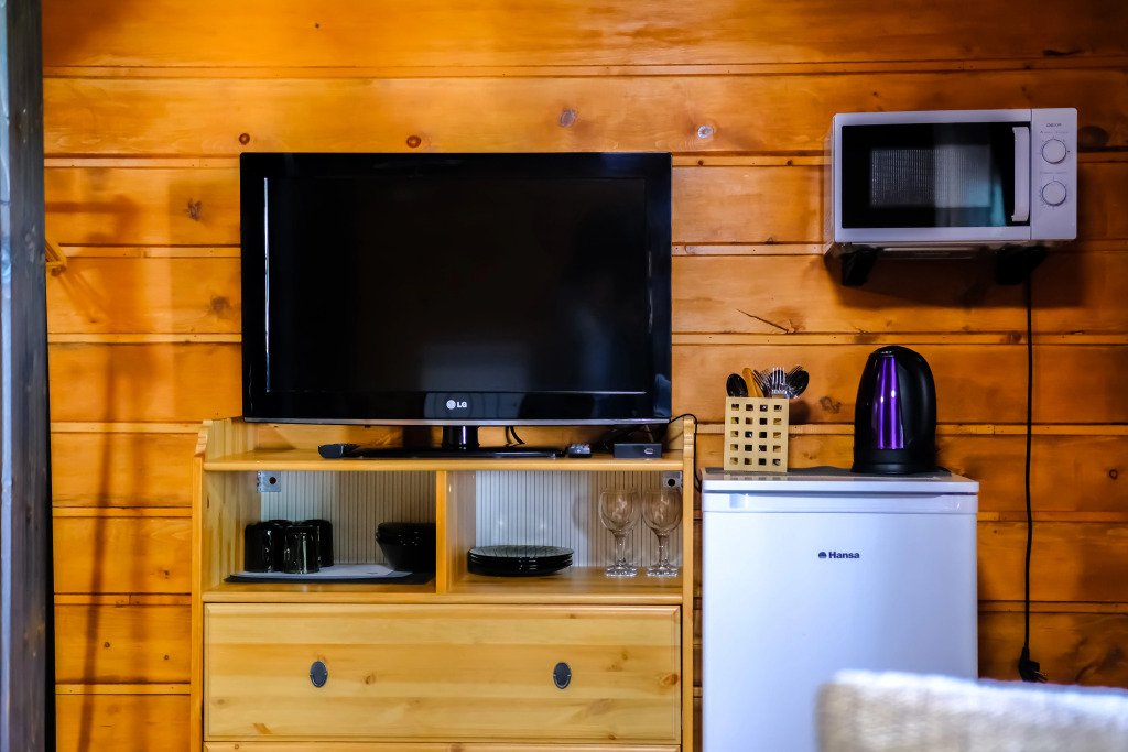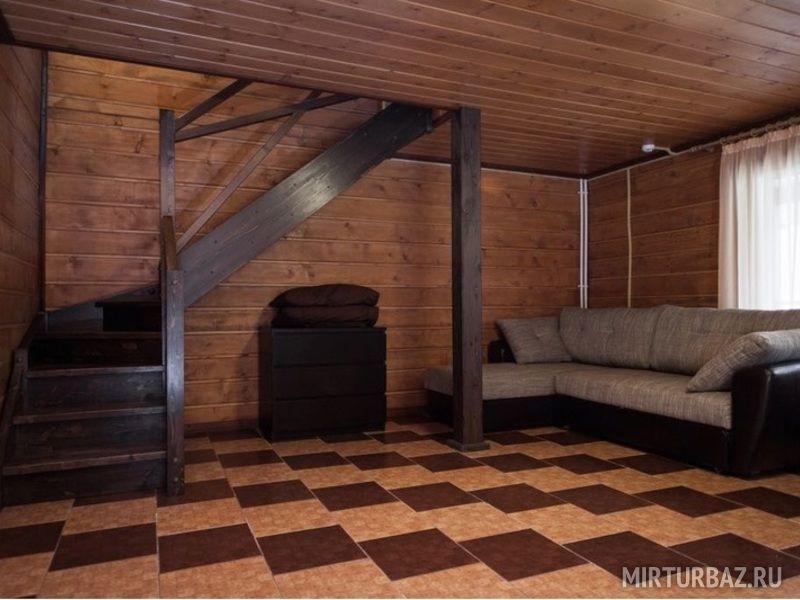На 2-ом этаже — две двуспальные кровати, на 1-ом — раскладывающийся диван. Евро-раскладушка на доп месте. Удобства — ТВ, кухня с микроволновоью печью и чайником, необходимой посудой, душ, полотенца.