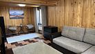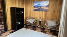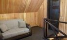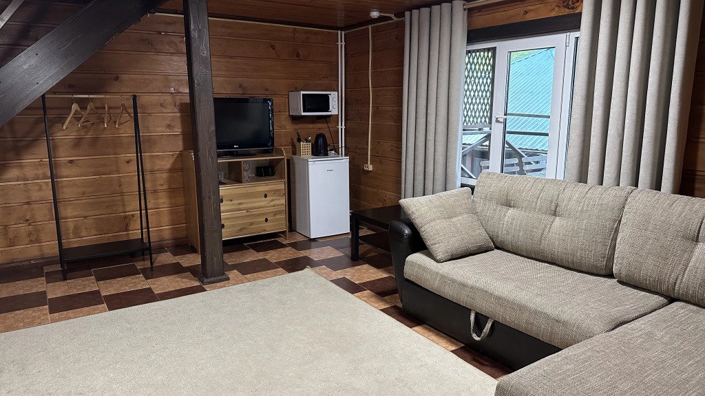 На 1-ом этаже — гостиная с кухонной зоной и двуспальным диванов, на 2-ом этаже спальня с большой кроватью и двухспальный диван в холле. Возможно 2 доп. места на евро раскладушке. Удобства — ТВ, кухня с микроволновой печью и чайником, необходимой посудой, душ, полотенца.