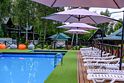 В стоимость билета включено: пользование парковкой , посещение открытого бассейна, пользование свободными шезлонгами, летним душем и раздевалками, детской площадкой и детским бассейном.Оборудован шезлонгами. Предусмотрено отделение для купания детей.