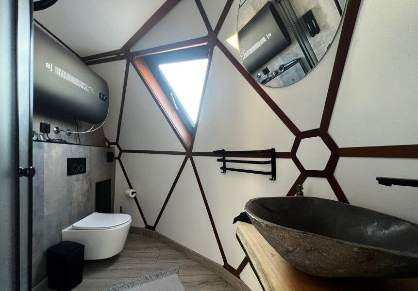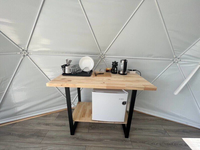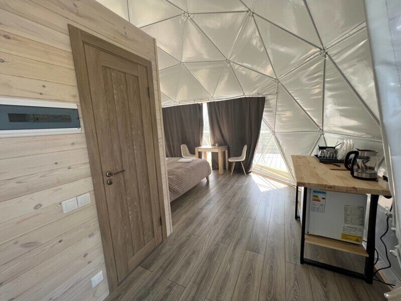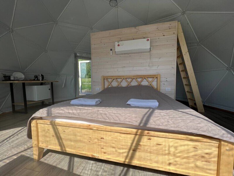 Сфера-это купольный дом с террасой, внутри сферы вас ждет удобная мини-кухня с обеденным столом и стульями, просторная двуспальная кровать обеспечит вам спокойный и комфортный сон, для детей на втором этаже имеется двуспальный матрас, создавая уютное место для их отдыха, а кондиционер поможет даже в самую знойную жару. Особенностью этого уникального домика является панорамное окно, через которое открывается потрясающий вид на горы и живописную реку Катунь.