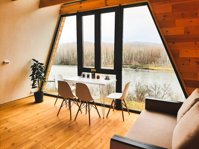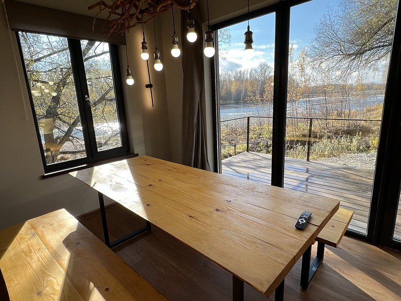 Отдельный домик в стиле «барнхаус» площадью 40 кв.м. с террасой с видом на реку Катунь. Две раздельные комнаты, общая зона с кухней.