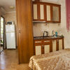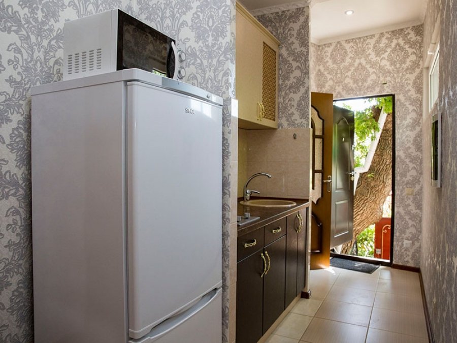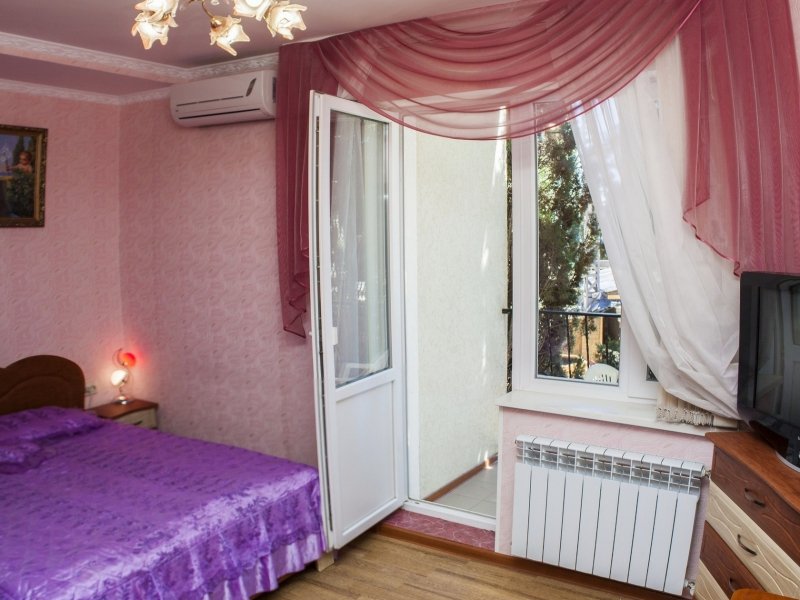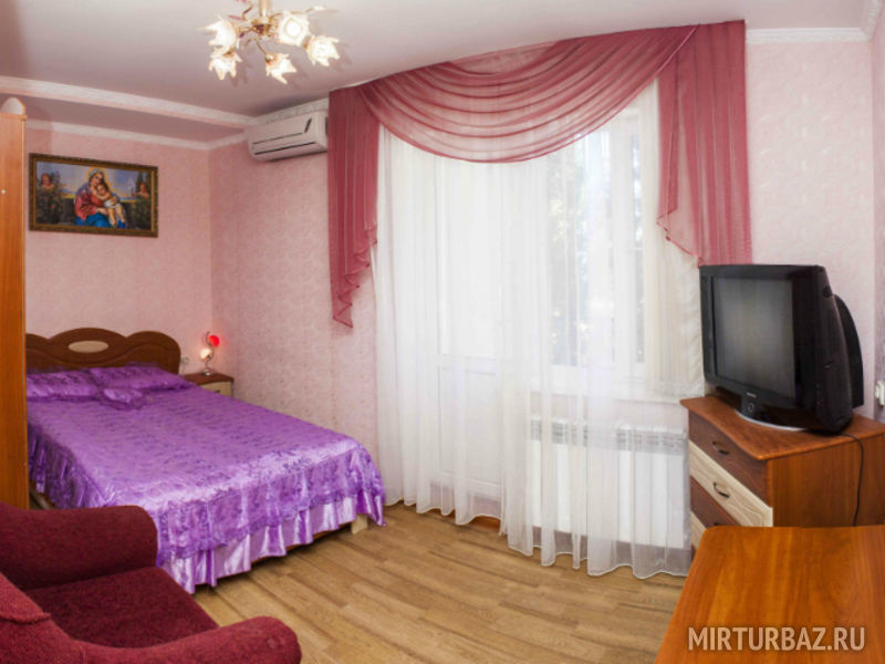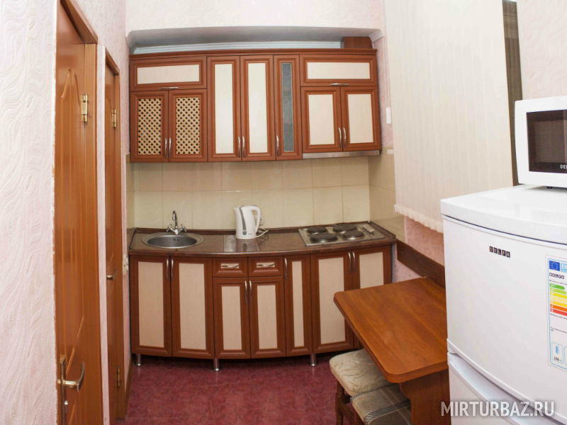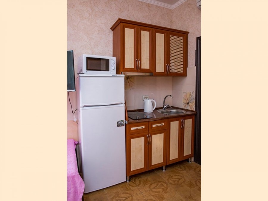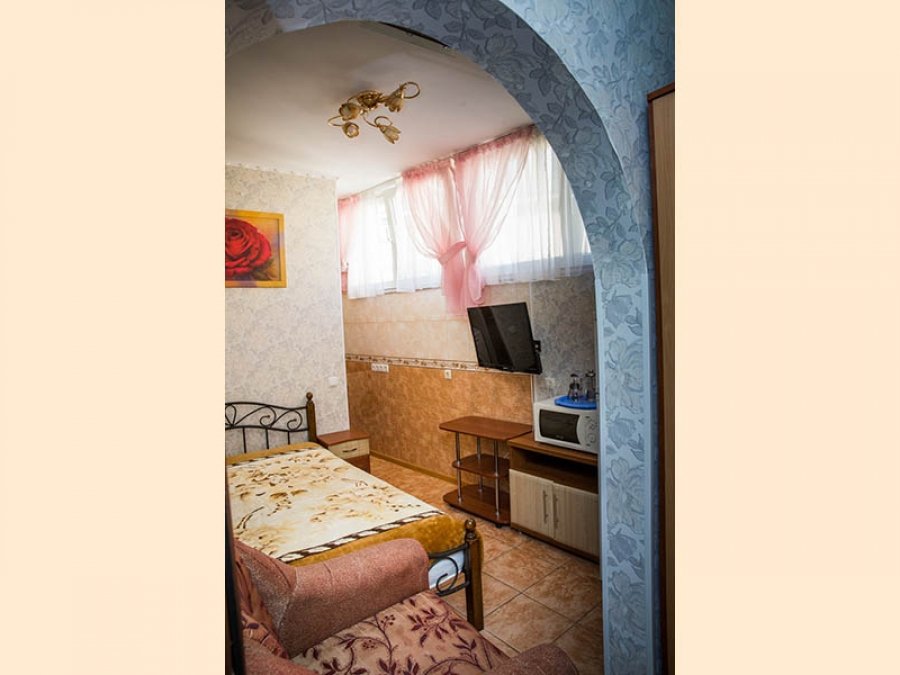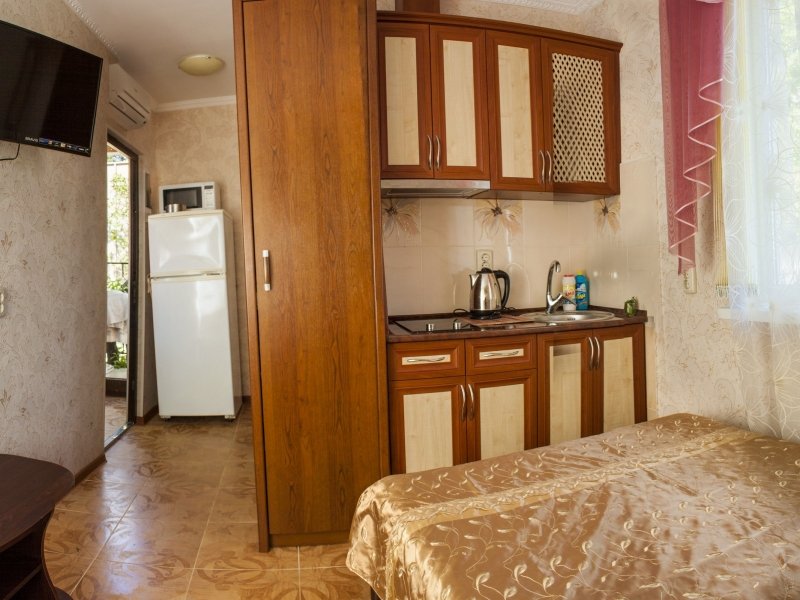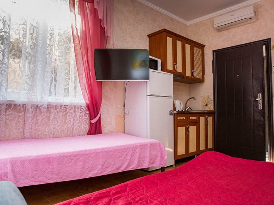 Небольшой стандартный номер с балконом. На балконе столик со стулом. Номер для двоих гостей. Возможно доп.место для ребенка. Кондиционер, телевизор, Wi-Fi, стиральная машина автомат. Двуспальная кровать, шкаф, стол, 2 табурета, кресло-кровать, постельные принадлежности, настенная вешалка-прихожая. Мини-кухня с электроплитой, вытяжкой, шкафчиками, рабочей поверхностью, раковиной. Холодильник, электрочайник, микроволновая печь. Кастрюли, сковородки, стаканы, кружки, тарелки, ложки, вилки, нож, досточка, открывашка, губка и тряпочка для посуды/стола, моющее средство для посуды. Душевая кабина, туалет, гарнитур с раковиной и зеркалом, бойлер, полотенцесушитель, фен, утюг, банные и лицевые полотенца, туалетная бумага, мыло.В номере