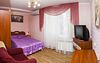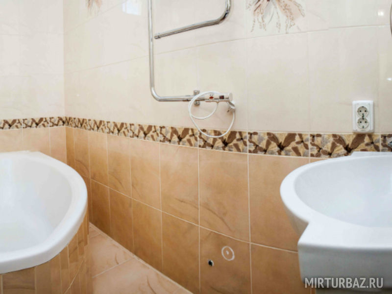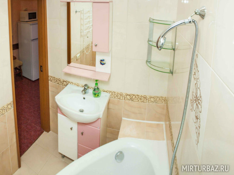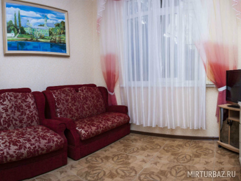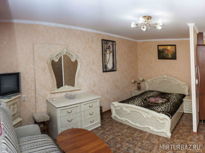 Кондиционер, телевизор, Wi-Fi, стиральная машина автомат. Двуспальная кровать, 1,5-спальный диван и кресло-кровать, постельные принадлежности, комод с зеркалом, 2 тумбочки, стол, ТВ-тумба, шкаф, настенная вешалка-прихожая с тумбочкой для обуви, 4 табурета, стол. Кухня с электроплитой, вытяжкой, шкафчиками, рабочей поверхностью, раковиной. Холодильник, электрочайник, микроволновая печь. Кастрюли, сковородки, стаканы, кружки, тарелки, ложки, вилки, нож, досточка, открывашка, губка и тряпочка для посуды/стола, моющее средство для посуды. Туалет с раковиной, шкафчиком и зеркалом, ванная комната с раковиной и гарнитуром, бойлер, полотенцесушитель, фен, утюг, банные и лицевые полотенца, туалетная бумага, мыло.В номере