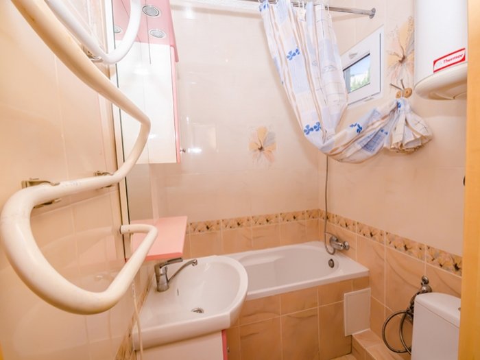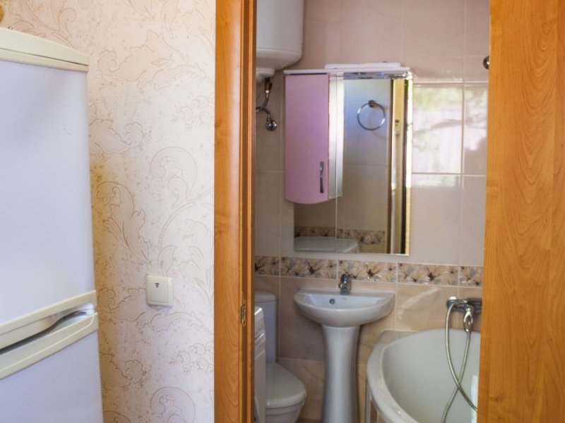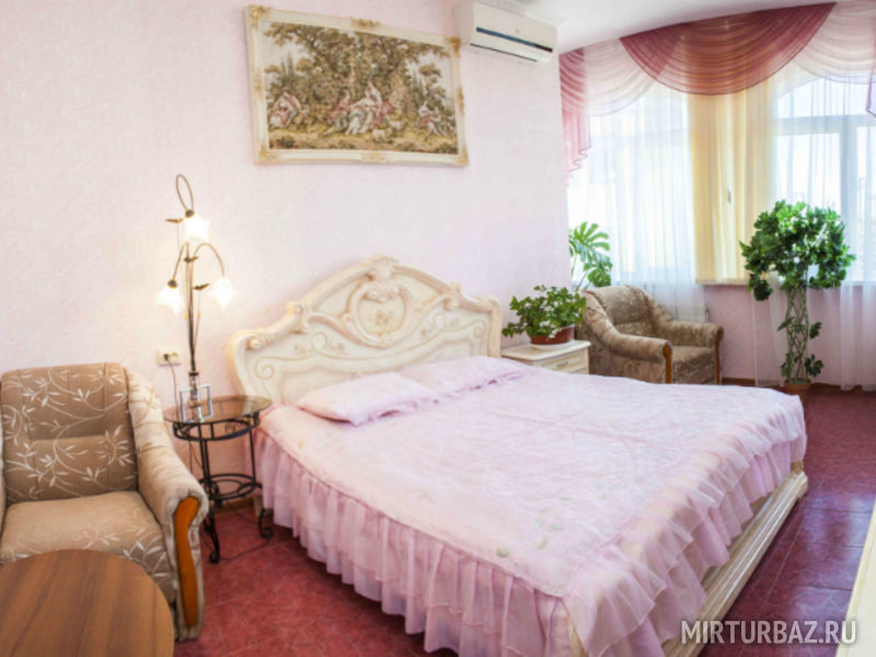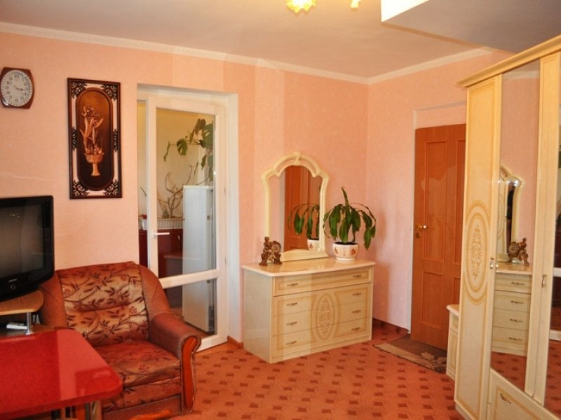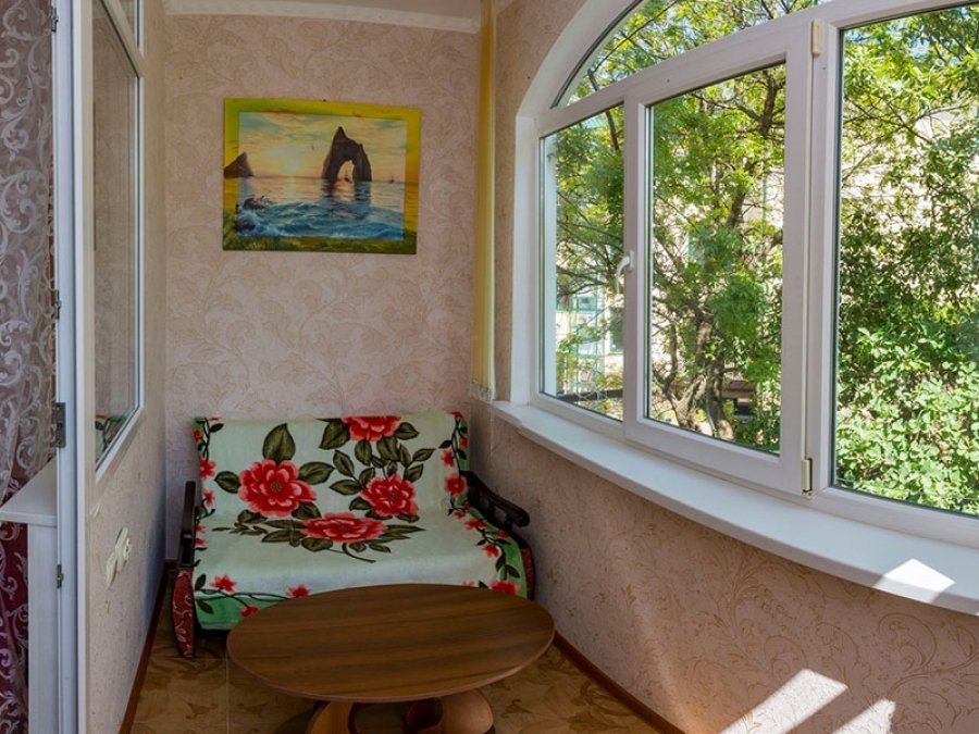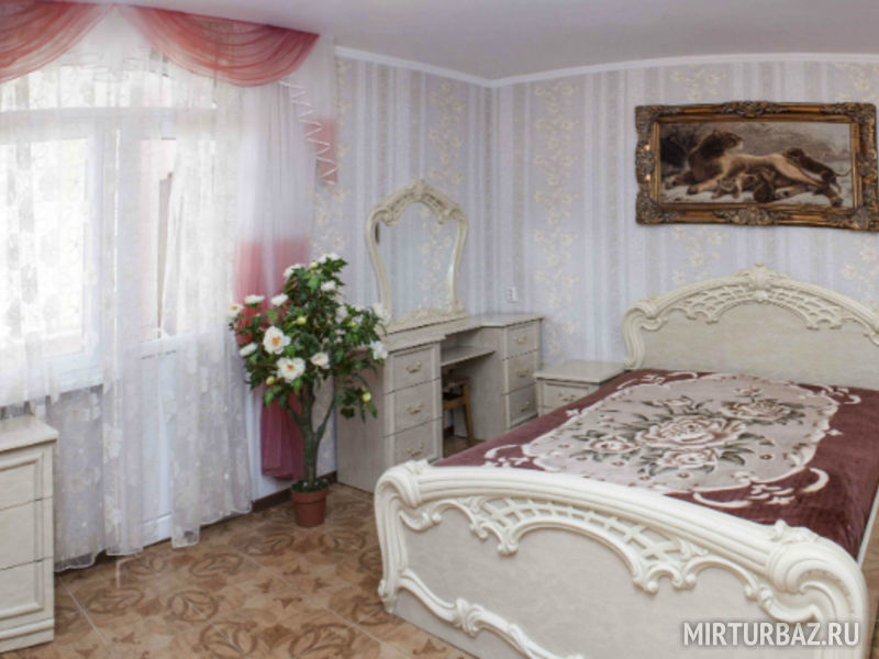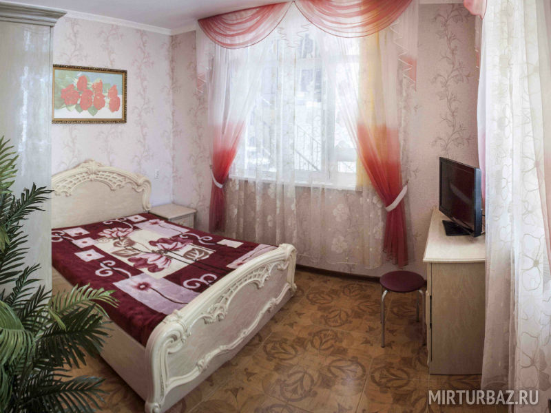 Номер на втором этаже с балконом. На балконе шезлонг, столик и два стула со спинками. 2 комнаты, кухня, 2 кондиционера, 2 телевизора, Wi-Fi, стиральная машина автомат. Основных мест - 4, дополнительных - 1. Площадь номера - 35 кв.м. В большой комнате (с балконом) двуспальная кровать, кресло-кровать, тумбочка, 2 комода, шкаф, стол, 3 табурета, кондиционер, ТВ. В маленькой комнате двуспальный диван, комод, тумбочка, кондиционер, ТВ. Кухня с электроплитой, вытяжкой, шкафчиками, рабочей поверхностью, раковиной. Холодильник, электрочайник, микроволновая печь. Кастрюли, сковородки, стаканы, кружки, тарелки, ложки, вилки, нож, досточка, открывашка, губка и тряпочка для посуды/стола, моющее средство для посуды. Ванная комната с туалетом, гарнитур с раковиной с зеркалом, бойлер, полотенцесушитель, корзина для белья, фен, утюг, все постельные принадлежности, банные и лицевые полотенца, туалетная бумага, мыло.В номере