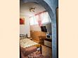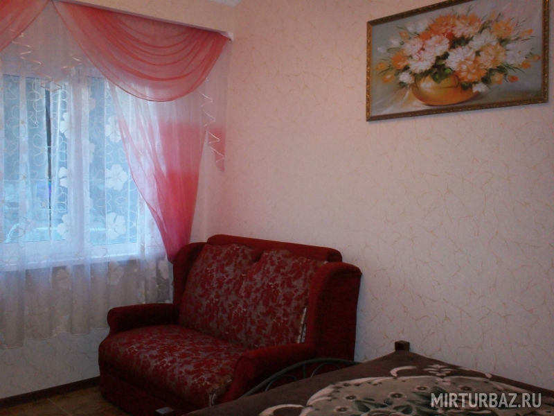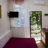 Комната на втором этаже с застекленной верандой. Кондиционер, телевизор, Wi-Fi, стиральная машина. Двуспальная кровать, односпальная кровать, на веранде 1,5-спальный раскладной диван и журнальный столик, 2 табурета, постельные принадлежности, настенная вешалка, шкаф-пенал, тумба. Мини-кухня с электроплитой, вытяжкой, шкафчиками, рабочей поверхностью, раковиной. Холодильник, электрочайник, микроволновая печь. Кастрюли, сковородки, стаканы, кружки, тарелки, ложки, вилки, нож, досточка, открывашка, губка и тряпочка для посуды/стола, моющее средство для посуды. Ванная комната с туалетом, раковина с зеркалом, бойлер, полотенцесушитель, фен, утюг, банные и лицевые полотенца, туалетная бумага, мыло. Площадь комнаты - 19 кв. м. Количество мест - 3. Доп.мест - 1. Вид из комнаты: прекрасный вид во дворик с цветами и беседками, водоемом с рыбками.В номере