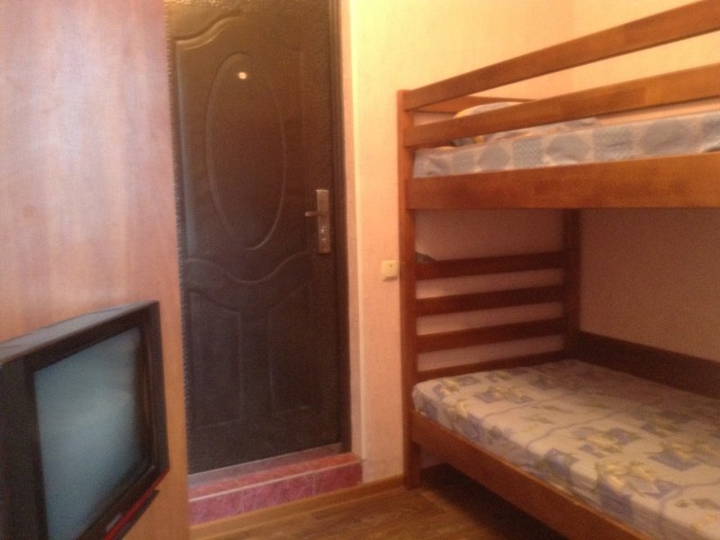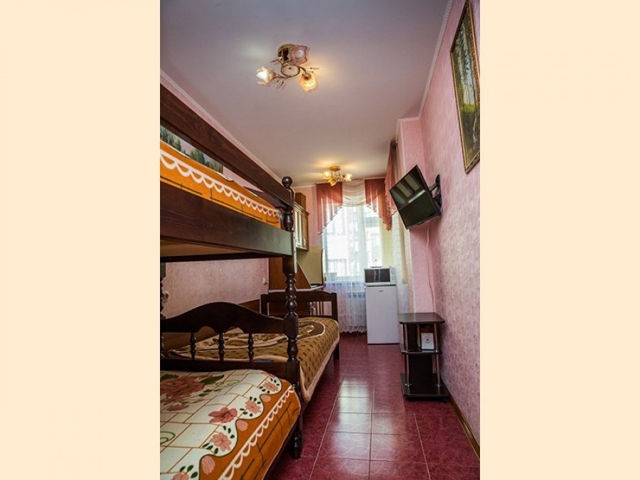 Эконом с двухъярусной кроватью и 1,5-спальным диванчиком Двухъярусная кровать, шкаф, тумбочка, комод, табурет, постельные принадлежности. Кондиционер, телевизор, Wi-Fi, холодильник, электрочайник, микроволновая печь. Стаканы, кружки, тарелки, ложки, вилки, нож, досточка, открывашка, губка и тряпочка для посуды/стола, кастрюля, сковородка. Ванная комната с туалетом, гарнитур с раковиной и зеркалом, бойлер, полотенцесушитель, фен, утюг, банные и лицевые полотенца, туалетная бумага, мыло.В номере