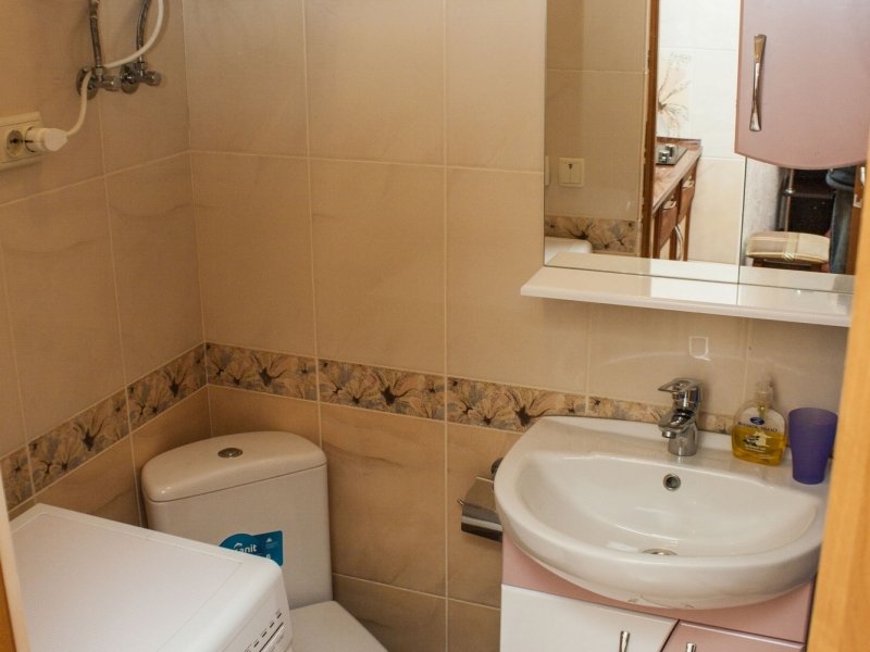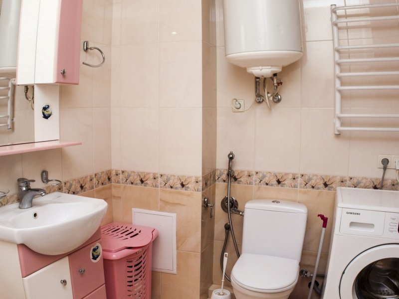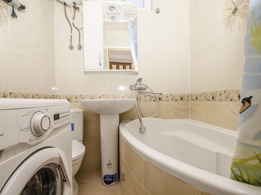 Кондиционер, телевизор, Wi-Fi, стиральная машина автомат. Двуспальная кровать, 1,5-спальный раскладной диван, постельные принадлежности, шкаф, комод, ТВ-тумба, стол, 4 табурета, настенная вешалка-прихожая с тумбочкой для обуви. Кухня с электроплитой, вытяжкой, шкафчиками, рабочей поверхностью, раковиной. Холодильник, электрочайник, микроволновая печь. Кастрюли, сковородки, стаканы, кружки, тарелки, ложки, вилки, нож, досточка, открывашка, губка и тряпочка для посуды/стола, моющее средство для посуды. Ванная комната с туалетом, гарнитур с раковиной с зеркалом, бойлер, полотенцесушитель, фен, утюг, банные и лицевые полотенца, туалетная бумага, мыло.В номере