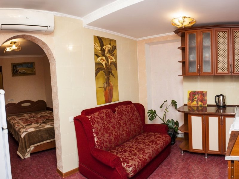 Кондиционер, телевизор, Wi-Fi, стиральная машина автомат. Двуспальная кровать, шкаф, журнальный столик, 1,5-спальный диванчик, постельные принадлежности. Мини-кухня с электроплитой, вытяжкой, шкафчиками, рабочей поверхностью, раковиной. Холодильник, электрочайник, микроволновая печь. Кастрюли, сковородки, стаканы, кружки, тарелки, ложки, вилки, нож, досточка, открывашка, губка и тряпочка для посуды/стола, моющее средство для посуды. Душевая кабина, туалет, гарнитур с раковиной и зеркалом, бойлер, полотенцесушитель, фен, утюг, банные и лицевые полотенца, туалетная бумага, мыло.В номере