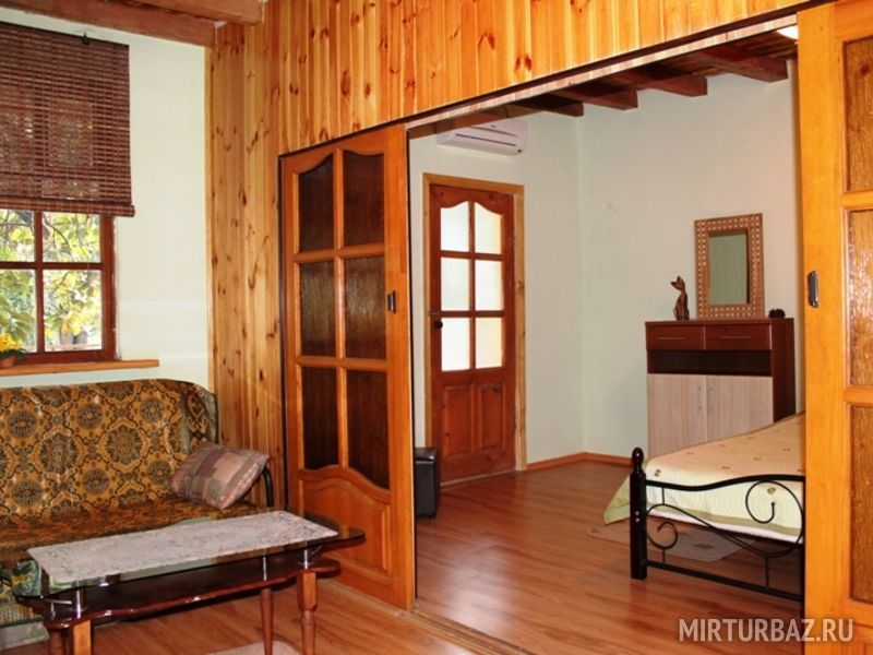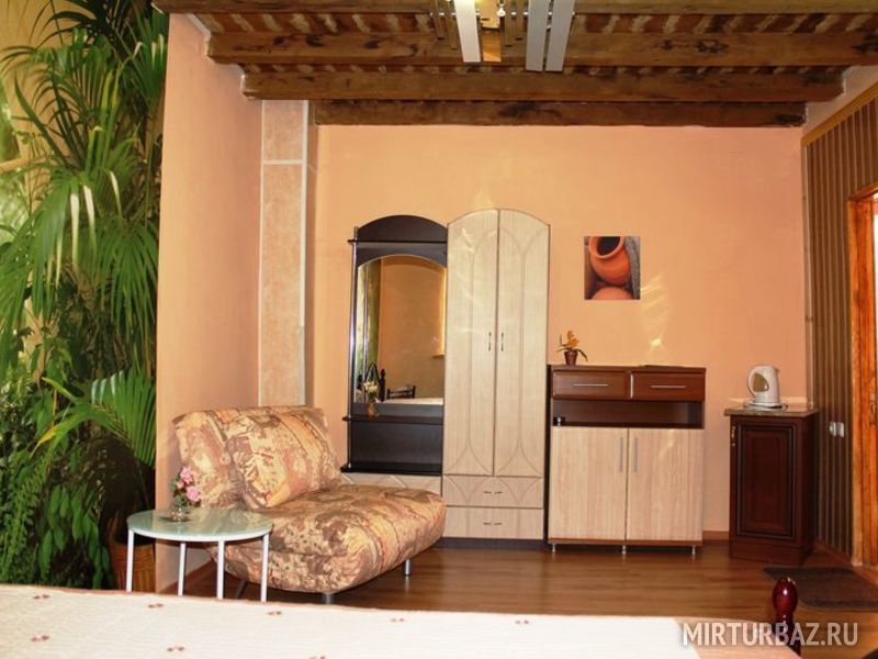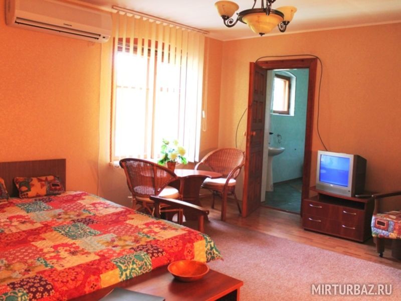 Просторный двухкомнатный номер, рассчитанный на 4 человека или менее. Комнаты смежные. Номер обустроен по-домашнему и с комфортом: ортопедические раскладные диваны и кресла, тумбочки, вместительный шкаф для одежды, телевизор, холодильник, чайник, доступ к Интернету, стол и стулья. Есть свой отдельный балкон с видом на море. Прямо на стол свисают ветви, увешанные гроздьями сладкого Крымского винограда…Санузел смежный, состоит из душевой кабины, умывальника, унитаза.