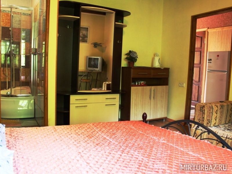 Номер новый, 2х-комнатный, рассчитан на 4х человек. В номере есть большая двуспальная кровать, раскладной диван, тумбочка, телевизор, холодильник, доступ к Интернету. Есть свой отдельный балкон с непанорамным видом на кусочек моря и реликтовую магнолию, распускающую в конце июня - июле свои огромные белоснежные цветы прямо у вас на глазах! Санузел смежный, состоит из душевой кабины, умывальника, унитаза.