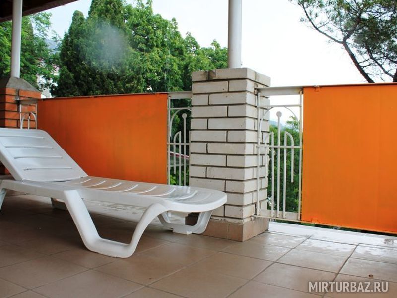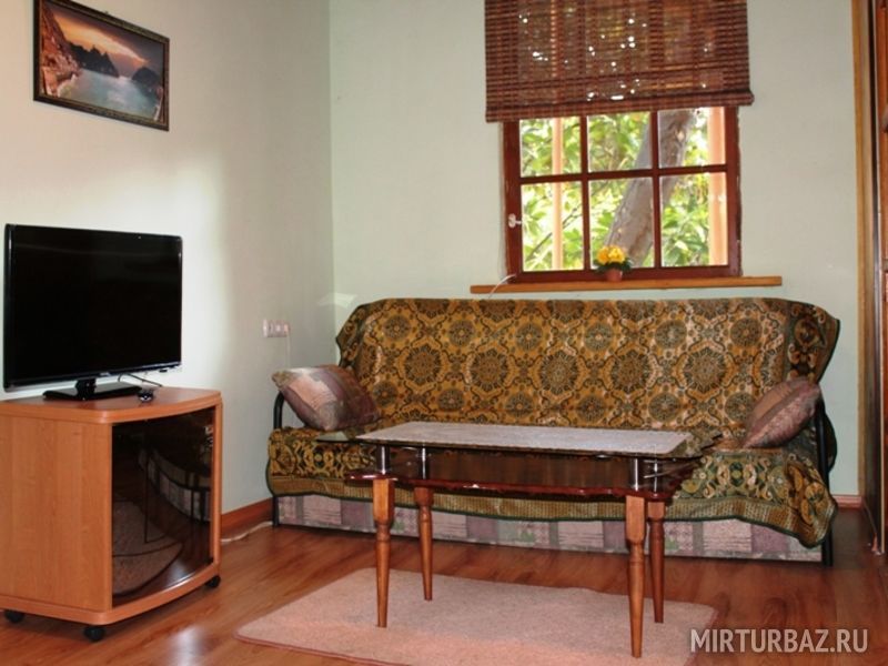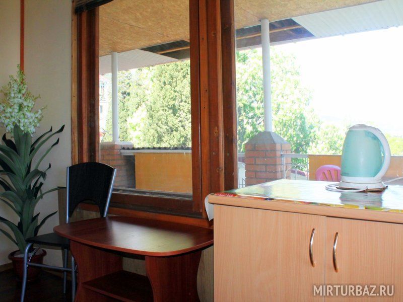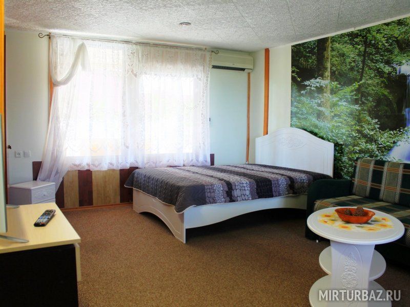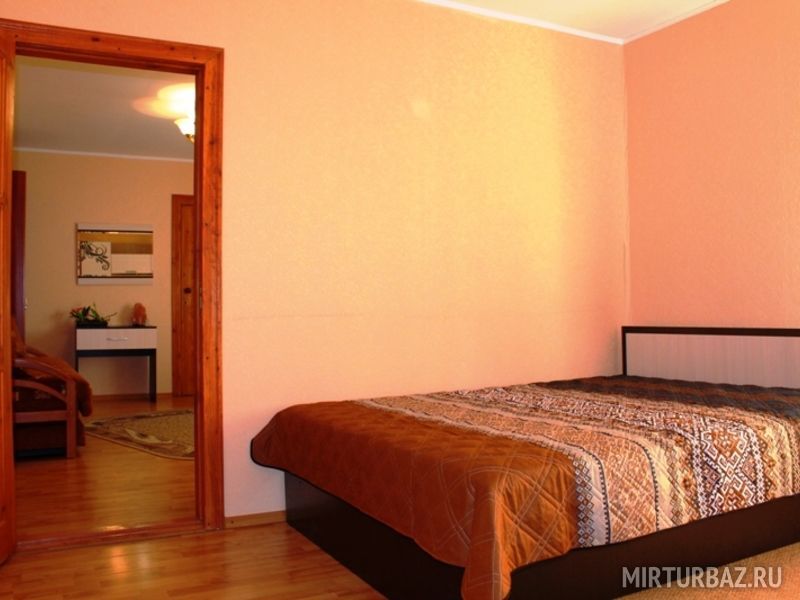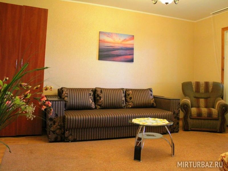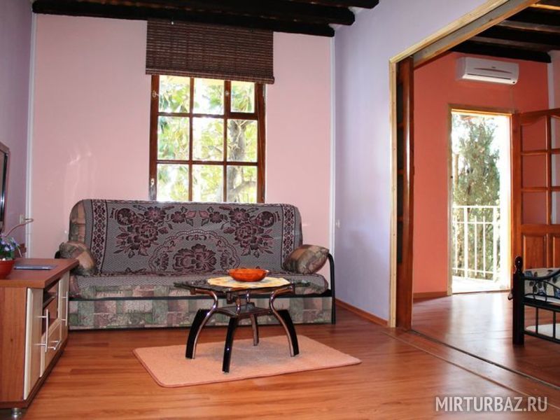 Номер большой и комфортный, рассчитан на 6 человек. Две смежные комнаты обустроены очень уютно: раскладные, удобные, ортопедические диваны и кресла, тумбочки, вместительный шкаф для одежды, телевизор, холодильник, доступ к Интернету, стол и стулья. Изюминкой является огромная веранда-балкон, с которой открываются замечательные виды на величественные горы, манящее море и оживлённый город. Санузел смежный, состоит из душевой кабины, умывальника, унитаза. Номер востребован всеми категориями отдыхающих.