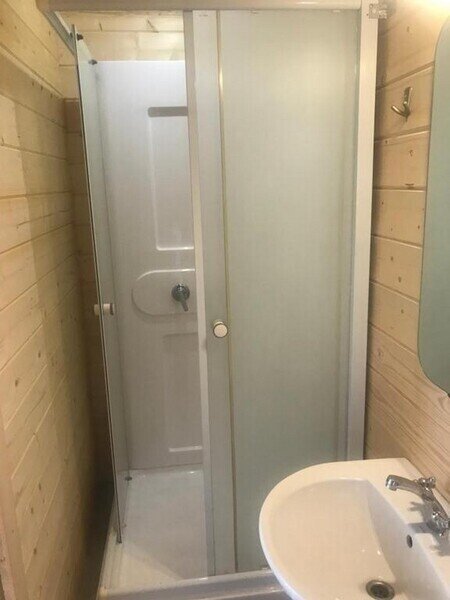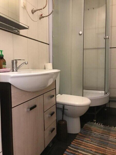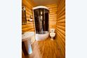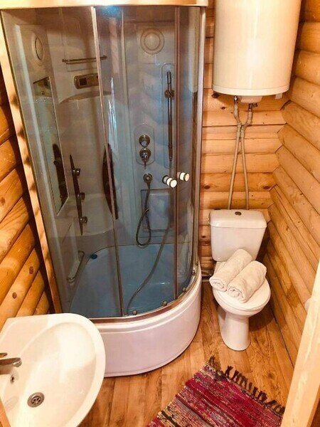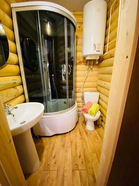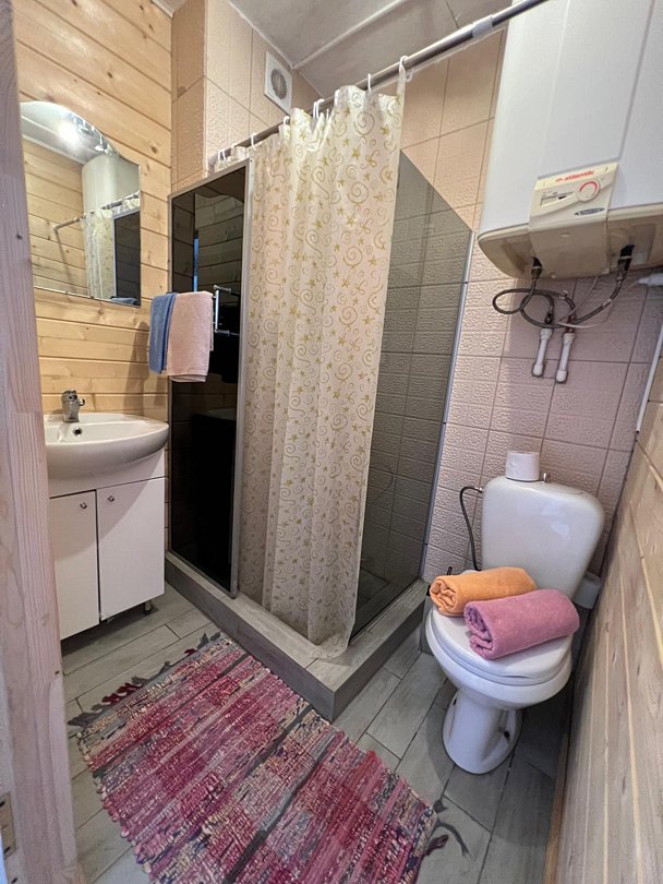 Индивидуальная ванная комната: душ, раковина, туалет.
