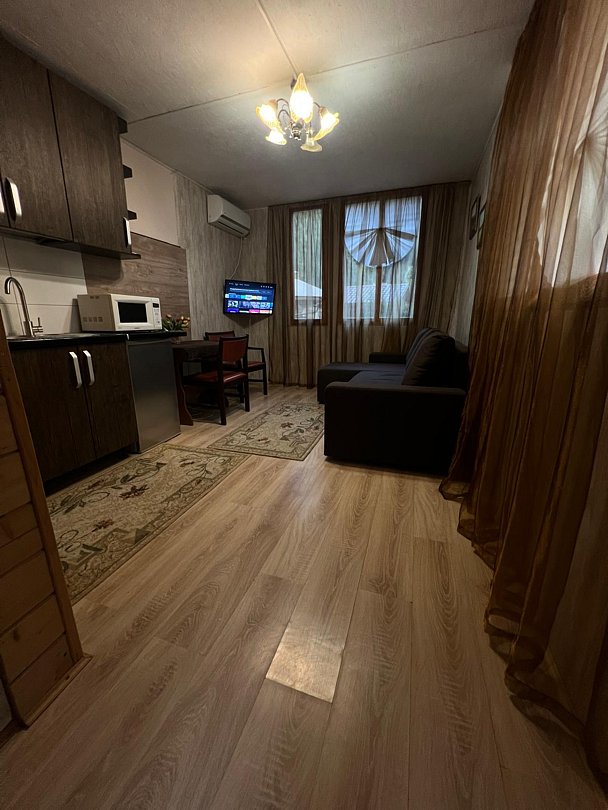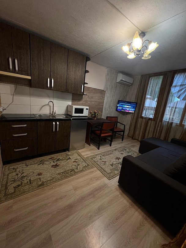 В номере: 1 двуспальная кровать, 1 диван односпальный, холодильник, чайник, посуда, столовые приборы, телевизор, кондиционер, отопление, шкаф, вешалка для одежды, зеркало в полный рост, антимоскитная сетка, полотенце, мыло, тапочки, удобная качественная мебель, сейф.