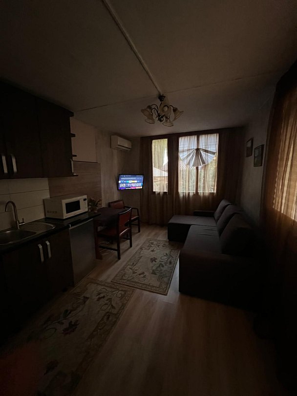 Имеется мини кухня, столовые приборы, посуда, плита электрическая, телевизор, чайник, кондиционер, шкаф, вешалка, зеркало, обеденный стол, журнальный столик, холодильник, стулья, антимоскитная сетка, отопление, стиральная машина. Терраса меблирована столом и стульями. Отдельный вход.