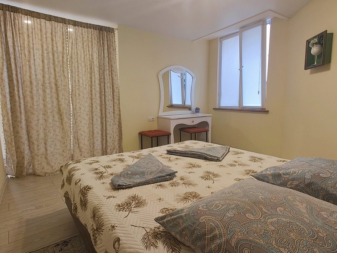 Этот однокомнатный номер, расположен на 3 этаже, общей площадью 15 м.кв., рассчитан на 2 гостей с возможностью дополнительного места. В нём есть уютная двуспальная кровать, мягкая тахта. Оснащён всей необходимой мебелью для комфортного отдыха, кондиционером, телевизором, Wi-Fi, посудой. К номеру прилегает небольшая проходная терраса для отдыха с боковым видом на море и величественные горы Ай-Петри. Из окна номера видна озеленённая территория соседнего двора и кусочек улицы Нагорной. Вместе с проживанием в этом номере Вы получаете: завтраки на двоих, место на закрытой охраняемой парковке (узнавайте наличие), пользование бассейном (в летний период), общей кухней, мангалом, мини-библиотекой, гладильными принадлежностями, Wi-Fi на всей территории гостевого дома, ежедневную уборку в номере, информационные услуги, помощь в организации досуга, все доступные нам скидки и акции, тепло и домашнее гостеприимство.В номере