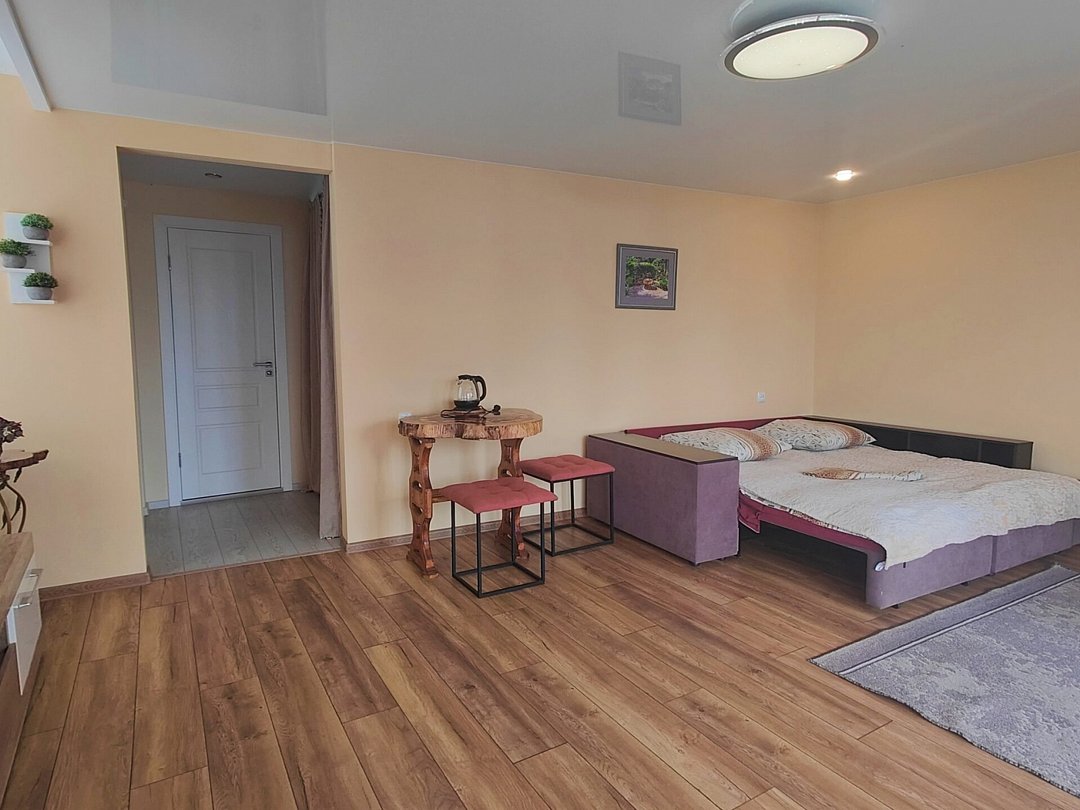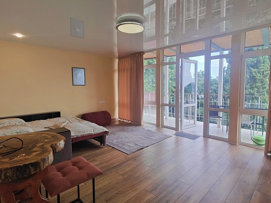 Двухкомнатный трёхместный номер, площадью 41 м.кв. с окнами в пол и видом на море! Светлый просторный номер, современный стильный интерьер и внимание к деталям, создающим комфорт, располагают к отдыху круглый год. Кондиционер, ТВ с доступом в интернет, мощный wi-fi, холодильник, электрочайник, обеденная зона и гостиная, балкон с видом на море. Деревянная мебель ручной работы придаёт интерьеру неповторимый шарм и подчёркивает его эстетичность.В номере