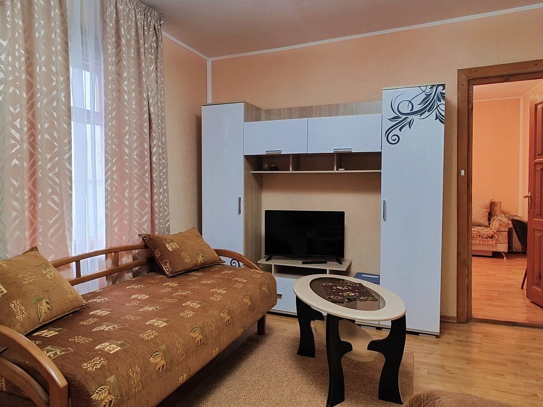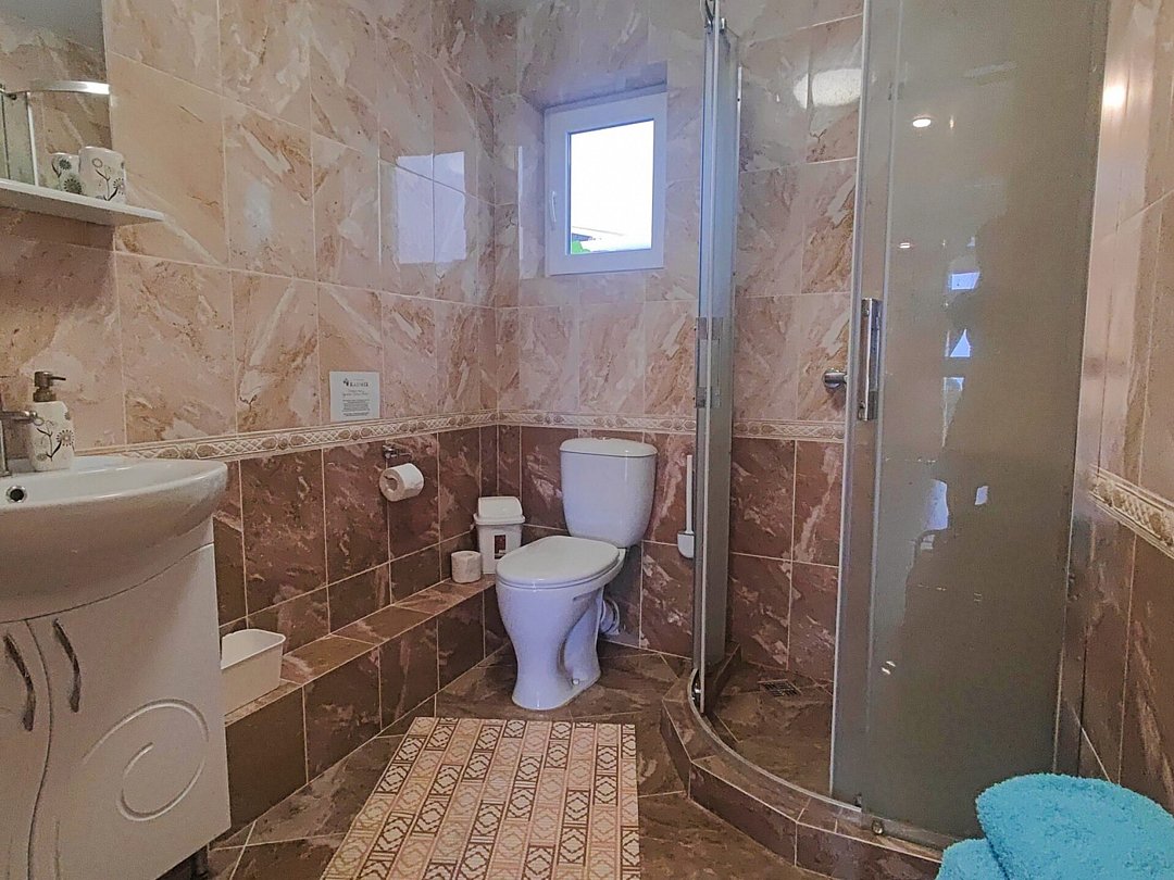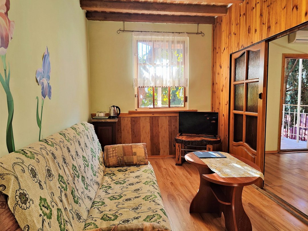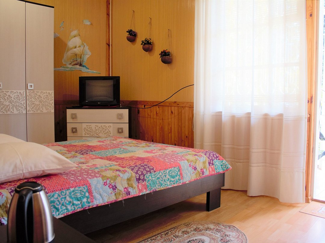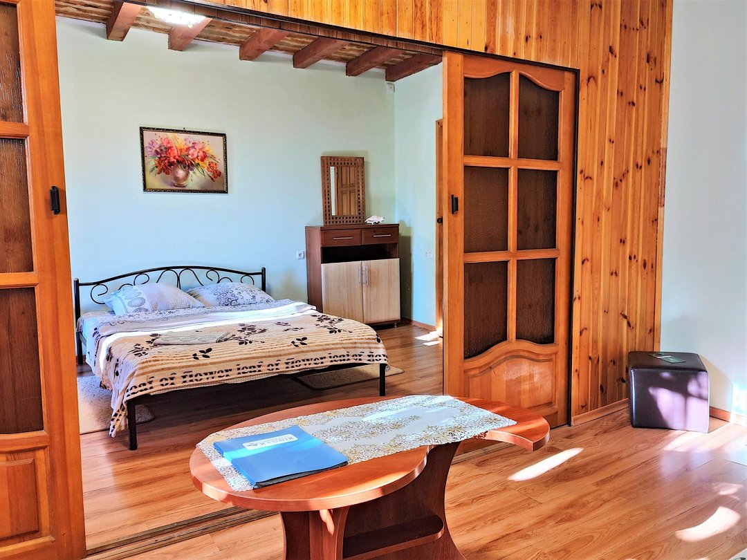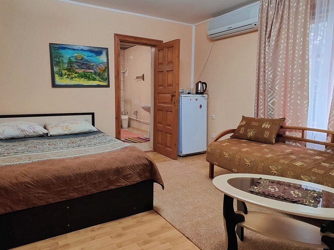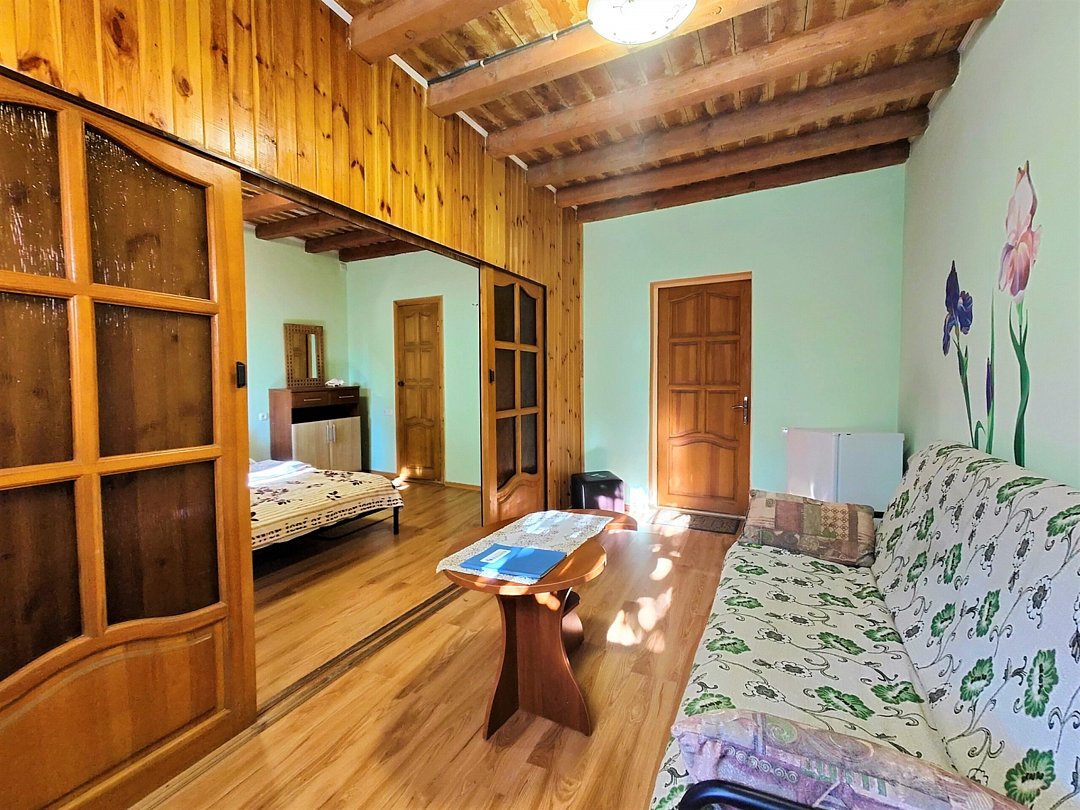 Номер 2-х комнатный, расположен на 2 этаже, общей площадью 40 м.кв., рассчитан на 3 человек. В качестве спальных мест — большая двуспальная кровать и удобный раскладной диван. Из технического оснащения: кондиционер, телевизор, холодильник, Wi-Fi. Удобством этого номера являются раздельные комнаты. Пользуется популярностью у семей с ребёнком, потому что позволяет родителям отдохнуть от ребёнка, а ребёнку дарит заветное личное пространство. Телевизор и кондиционер расположены в спальне. Имеется небольшой аккуратный балкон с частичным видом на море и на зелёный пейзаж окрестностей. Вместе с проживанием в этом номере Вы получаете: место на закрытой охраняемой парковке (узнавайте наличие), пользование бассейном (в летний период), общей кухней, мангалом, мини-библиотекой, гладильными принадлежностями, Wi-Fi на всей территории гостевого дома, ежедневную уборку в номере, информационные услуги, помощь в организации досуга, все доступные нам скидки и акции, тепло и домашнее гостеприимство.В номере