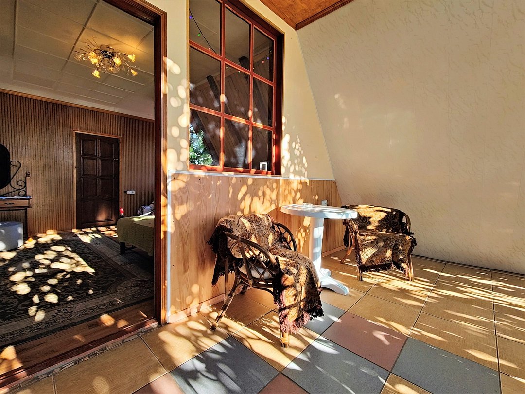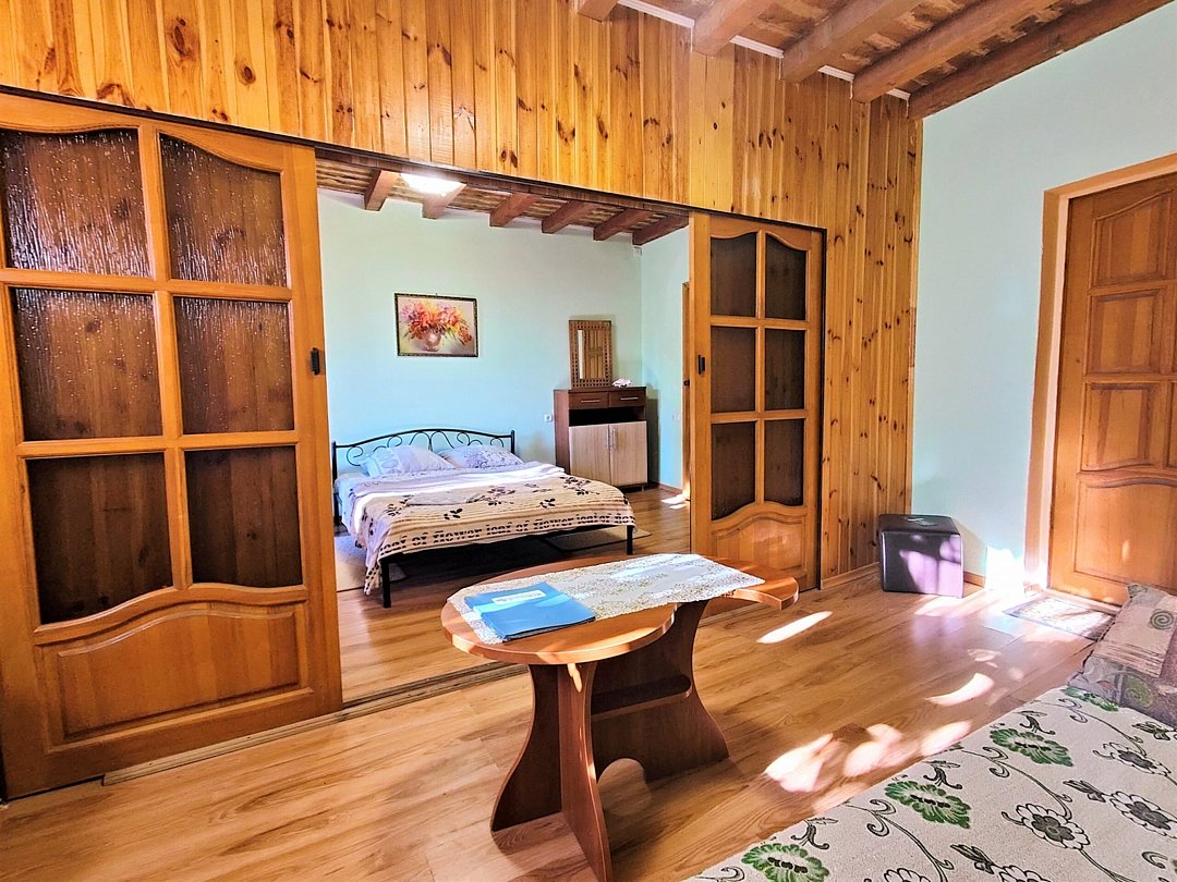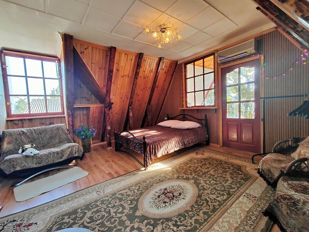 На втором этаже есть большой семейный номер площадью 50 квадратных метров, где могут разместиться до 4 человек. Возможно предоставление дополнительного места за дополнительную плату. Номер оформлен в уникальном рустик-стиле и состоит из двух смежных комнат. В номере есть большая двуспальная кровать, удобный ортопедический диван, телевизор, холодильник, электрочайник, кондиционер и высокоскоростной Wi-Fi. Изюминкой номера является огромная лоджия с видом на горы и море, украшенная крымским виноградом. Этот номер пользуется популярностью среди семей. Вместе с проживанием в этом номере Вы получаете: завтраки на четверых, место на закрытой охраняемой парковке (узнавайте наличие), пользование бассейном (в летний период), общей кухней, мангалом, мини-библиотекой, гладильными принадлежностями, Wi-Fi на всей территории гостевого дома, ежедневную уборку в номере, информационные услуги, помощь в организации досуга, все доступные нам скидки и акции, тепло и домашнее гостеприимство.В номере