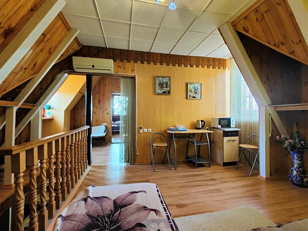 Двухкомнатный трёхместный номер с панорамными окнами с видом на море и горы Ай-Петри, площадью 41 м.кв! Номер выполнен в мансардном стиле. Вся мебель из дерева ручной работы нашего мастера-хозяина гостевого дома. С любовью к каждой детали и заботой о вашем комфорте мы создали уютный и современный номер, оснащённый кондиционером, мощным wi-fi, ТВ с доступом в интернет, холодильником, электрочайником, обеденной зоной, панорамным балконом и санузлом с видом на море! Номер располагает площадью для размещения четвёртого спального места за доп. оплату.В номере