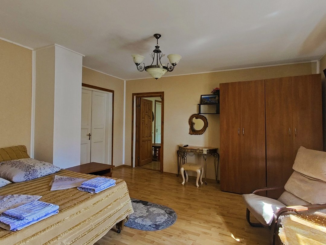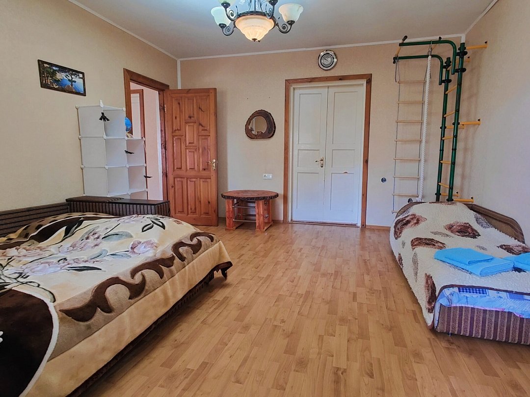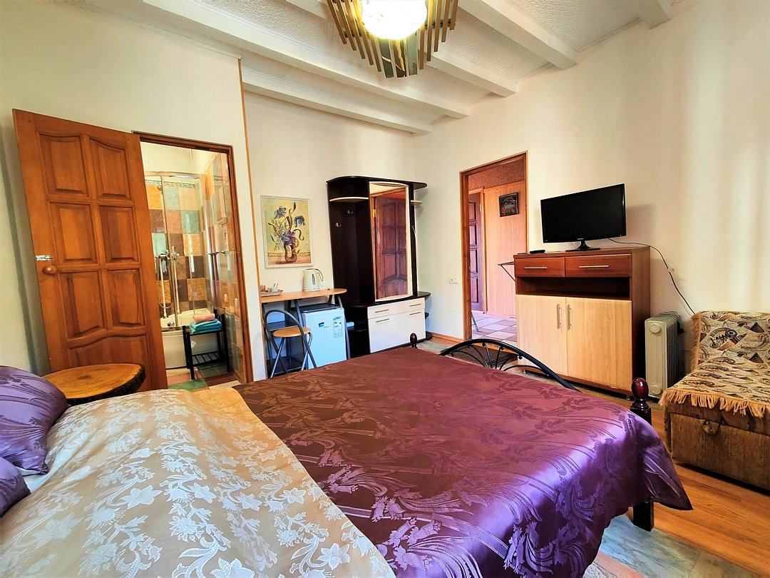 Просторный двухкомнатный семейный номер расположен на втором этаже, общей площадью 45 м.кв., рассчитан на 4 гостей с возможностью дополнительного места (за доп.оплату). Комнаты смежные. Номер обустроен по-домашнему и с комфортом: большая двуспальная кровать, ортопедический раскладной диван, ЖК телевизор, кондиционер, холодильник, электрочайник, высокоскоростной Wi-Fi. Санузел просторный. Номер располагает большим балконом с видом на море. Балкон проходной, через него проходят только гости из одного номера сверху. Прямо на стол свисают ветви, увешанные гроздьями сладкого Крымского винограда…Номер удобен для семей с детьми, поскольку помимо двуспальной кровати, располагает так же двумя раздельными спальными местами, обычно удобными для деток. Вместе с проживанием в этом номере Вы получаете: место на закрытой охраняемой парковке (узнавайте наличие), пользование бассейном (в летний период), общей кухней, мангалом, мини-библиотекой, гладильными принадлежностями, Wi-Fi на всей территории гостевого дома, ежедневную уборку в номере, информационные услуги, помощь в организации досуга, все доступные нам скидки и акции, тепло и домашнее гостеприимство.В номере
