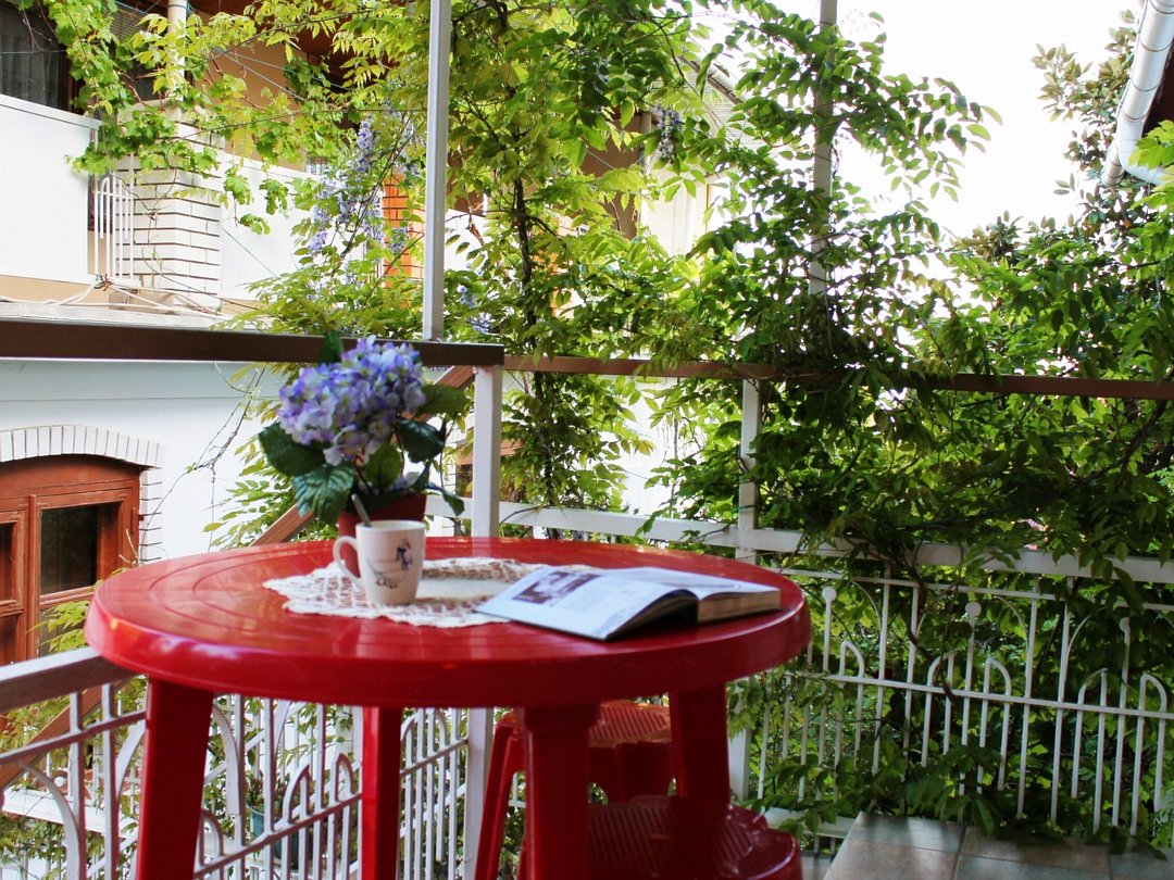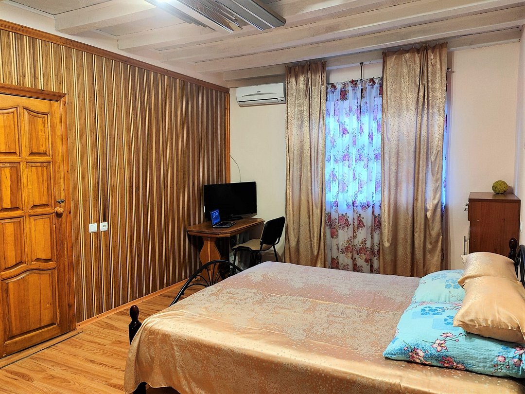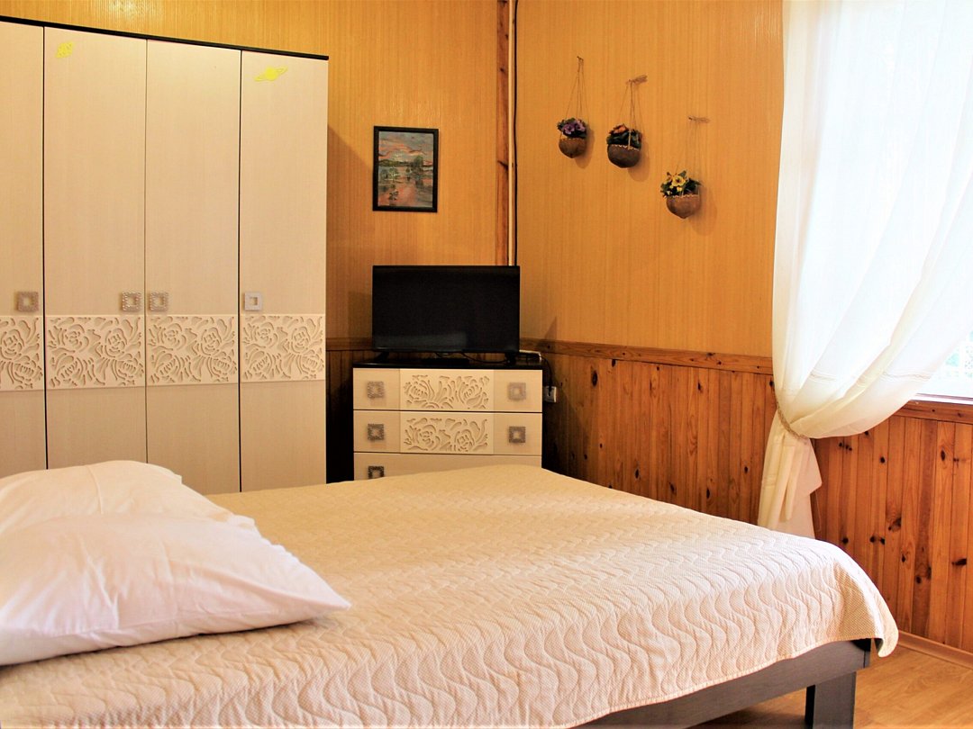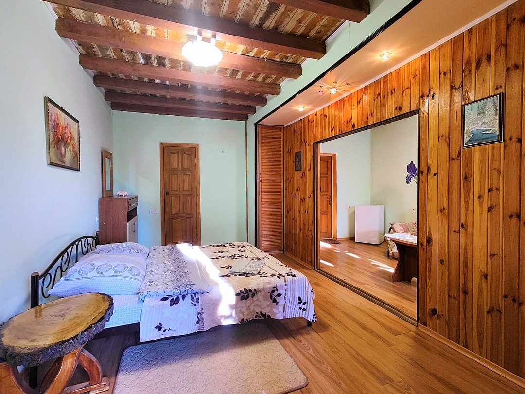 Этот просторный однокомнатный номер, располагается на 2 этаже, общей площадью 25 м.кв., рассчитан на 2 гостей с возможностью дополнительного места (за доп. оплату). Спальное место — большая двуспальная кровать. Оснащён холодильником, кондиционером, телевизором, Wi-Fi, посудой. К номеру прилегает небольшая терраса для отдыха. C террасы открывается прекрасный вид на зелёный цветущий сад и двор, из окна номера вид устремляется на озеленённую стену, а приоткрытое окно позволяет попасть по воздушному «коридору» в номер свежему морскому бризу. Номер идеален для любителей пространства и эко-материалов. Вместе с проживанием в этом номере Вы получаете: место на закрытой охраняемой парковке (узнавайте наличие), пользование бассейном (в летний период), общей кухней, мангалом, мини-библиотекой, гладильными принадлежностями, Wi-Fi на всей территории гостевого дома, ежедневную уборку в номере, информационные услуги, помощь в организации досуга, все доступные нам скидки и акции, тепло и домашнее гостеприимство.В номере