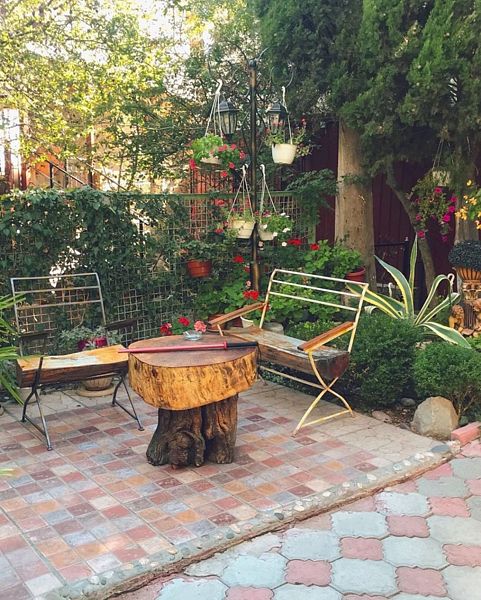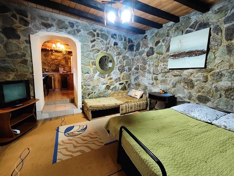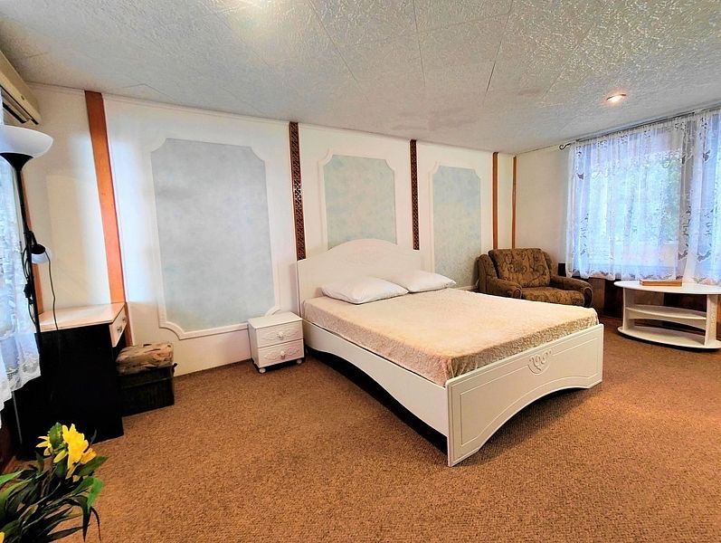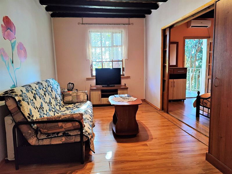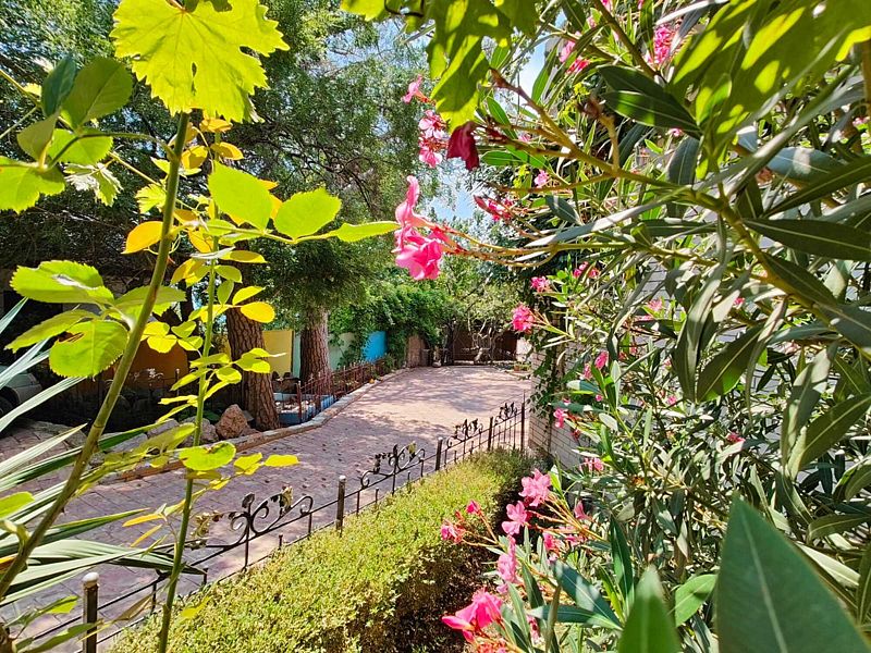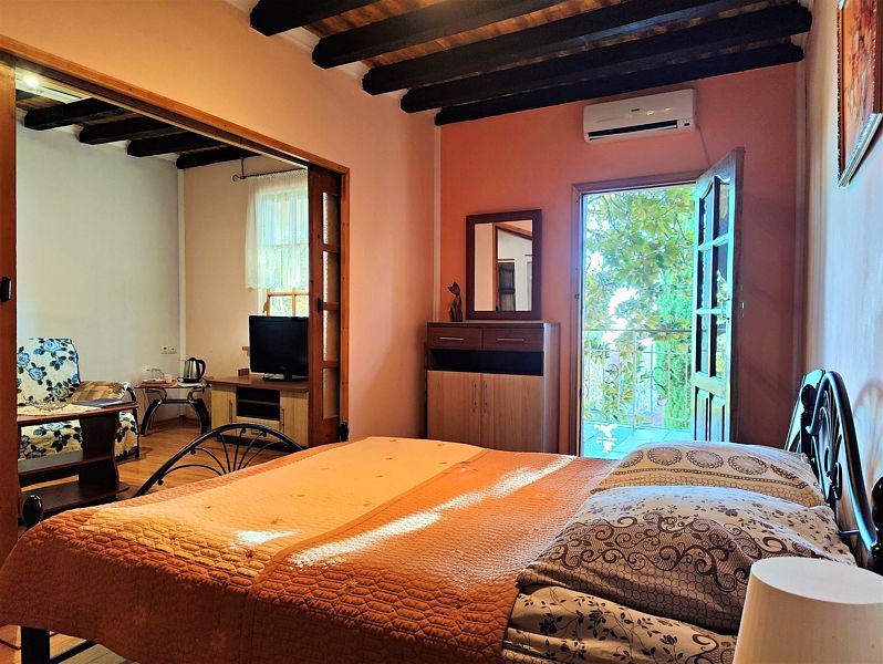 Мы как то привыкли отдыхать в хороших гостиницах, но за такие небольшие денежки у нас в номере было все: кондиционер, телевизор, холодильник, чайник, посуда, как в 5 звездах. И сервис на высоте! Все что не попросишь у персонала все делали и все давали: Посуду, полотенца, утюг, сушилку. Персонал отзывчивый, внимательный, душевный, как к родственникам приехал! Вечером очень приятно было посидеть на веранде в тишине и зарослях винограда с бокалом вина. К нам иногда приходил кот, которого погладишь и он мурлыкает, как заводной. На территории есть крытый бассейн с прозрачной водой, для меня маловат размерчик, а вот детям пожалуй будет рай! Мы не стали брать авто в прокат, когда поняли, что общественный транспорт в Крыму работает не хуже чем в Германии, но на территории есть закрытая парковка. Думаю машины на 4 точно. Предупреждаю, что такси в Крыму не работает поверьте нашему печальному опыту. А какой чудесный сад с многообразием растительности на территории. А цветы! Прям как цветники вокруг Ливадийского дворца. Представляю сколько труда и любви надо вложить в это! Кругом чистота и порядок. Мы возвращались с пляжа и на лестнице я заметил ветром накидало листву, переоделись и пошли за фруктами. 5 минут. Лестница была уже чистая. Я просто подумал! Жене очень нравилось по вечерам сидя на качелях в тишине читать книги. Вспомнил про невыносимые децибелы цикад вечером в Сочи. Сытные завтраки утром с выпечкой чаем и кофе по-турецки это отдельная изюминка Радмира. Я теперь жену упрекаю почему меня так не кормят дома!