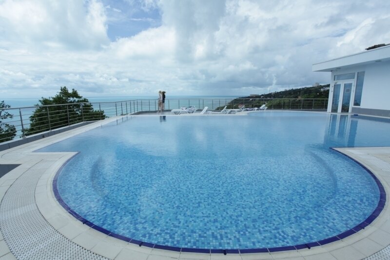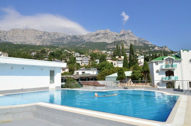 На крыше есть собственный бассейн с лежаками, откуда открываются виды на море и гору Айпетри.