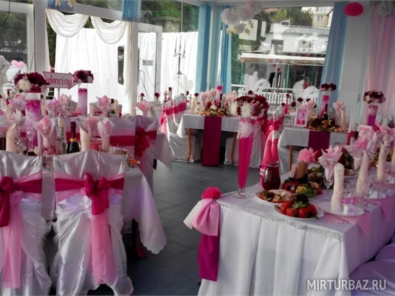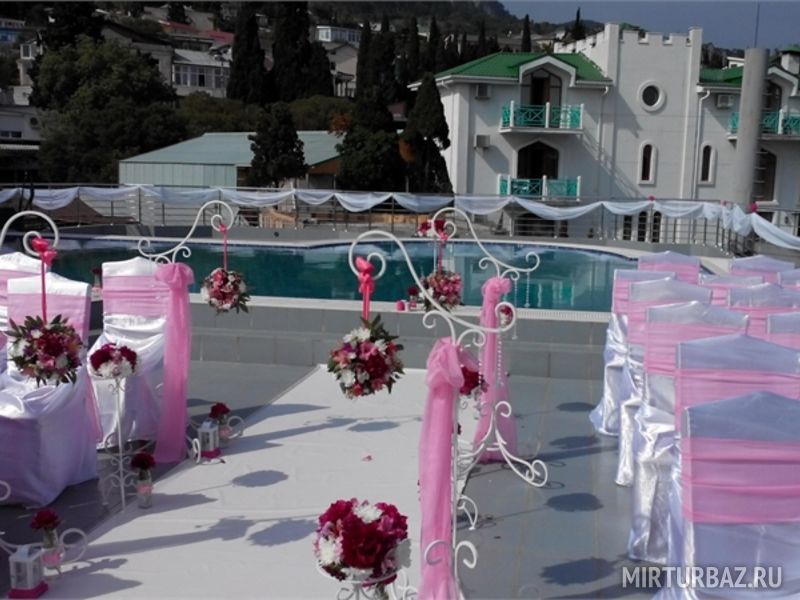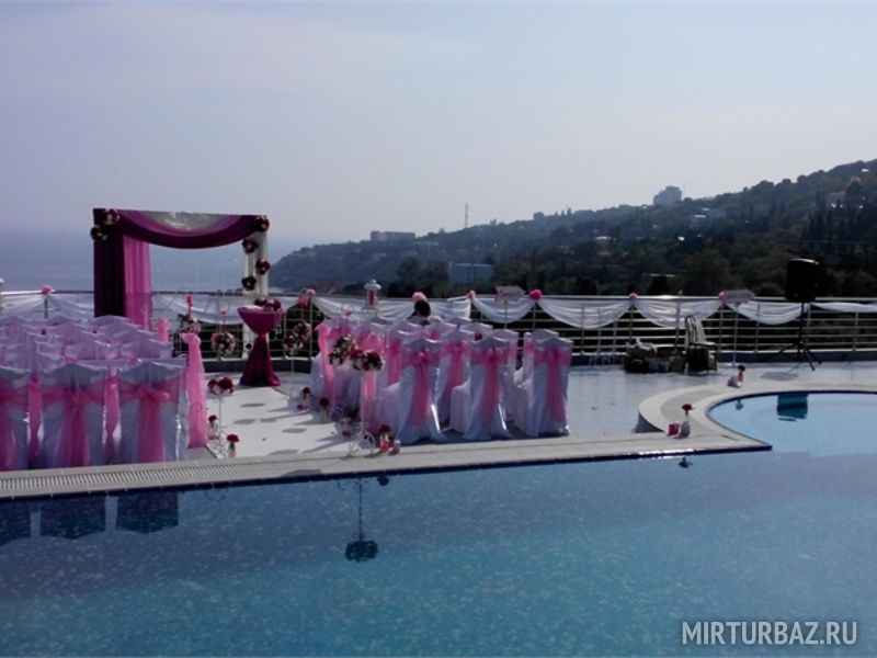 На территории отеля есть всё необходимое для проведения такого рода мероприятий как свадьба в Крыму. Отель Большой Ялты «РоЯлта» имеет большой вместительный конференц-зал, который легко трансформируется в банкетный и прекрасно подойдёт для свадебного застолья, а также широкая просторная терраса с умопомрачительным видом на город, парк и морскую гладь станет отличным местом для проведения церемонии бракосочетания. В парке, расположенном рядом с отелем, можно провести фотосессию с молодожёнами. Кроме того, что фотографии получатся красивые и оригинальные, это очень удобно и выгодно. В отеле "РоЯлта" ваша свадьба в Алупке пройдет на высшем уровне, ведь такой красивый полуостров Крым. Свадьба в отеле с бассейном будет особо интересна молодежи и любителям необычных ощущений. Но главное - в нашем отеле свадьба на берегу моря, цены на нее, непременно, порадуют Вас.