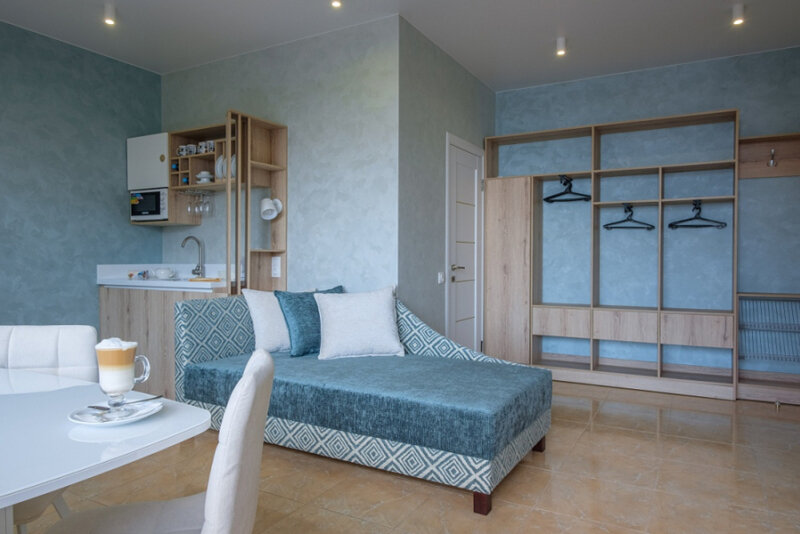 Большой солнечный номер с отдельной спальней. Имеет классическую гостиную-холл с удобными диваном и креслом. Домашняя обстановка номера дополняется наличием балкона с мебелью, где приятно отдохнуть в вечернее время.