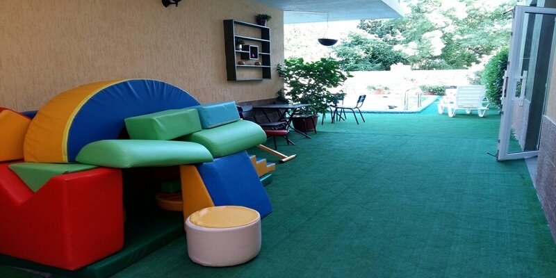 Для деток до 5–ти лет оборудована зона с игрушками и качелями–каталками, соответствующими возрасту и отвечающими стандартам безопасности.