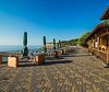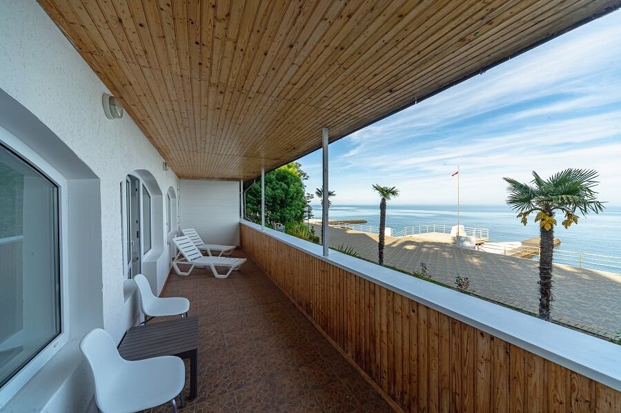 У пансионата 4 собственных больших оборудованных пляжа. На мелко-галечном побережье есть все, что нужно для отдыха у воды – кафе, шезлонги, зонтики от солнца, раздевалки.