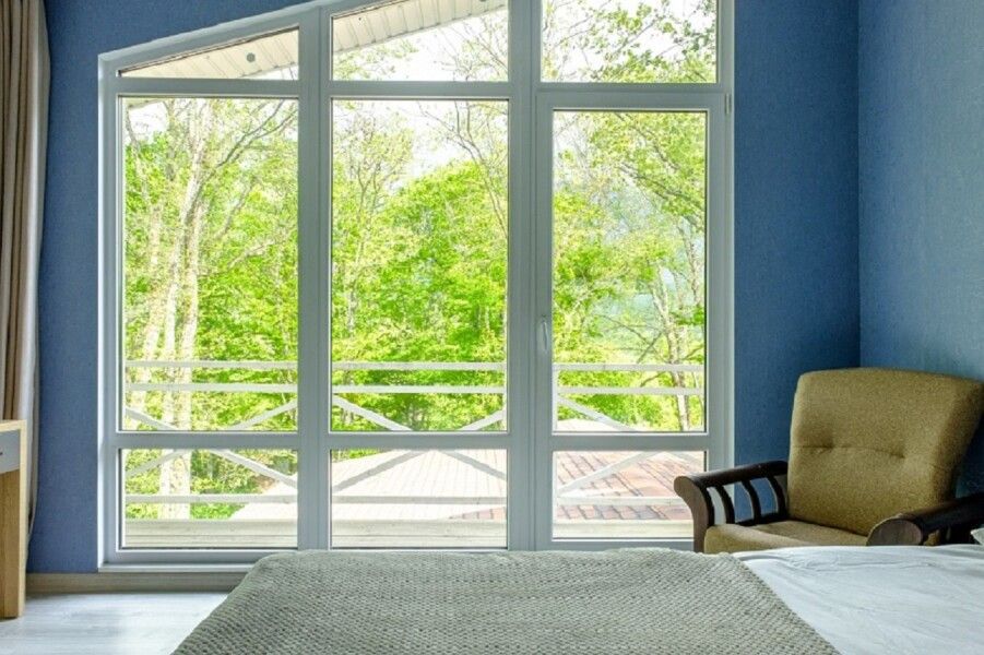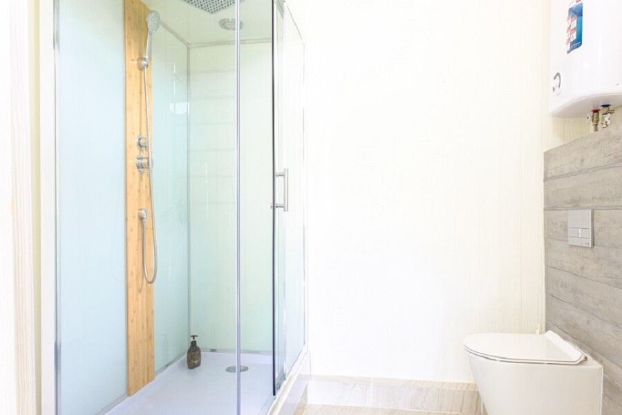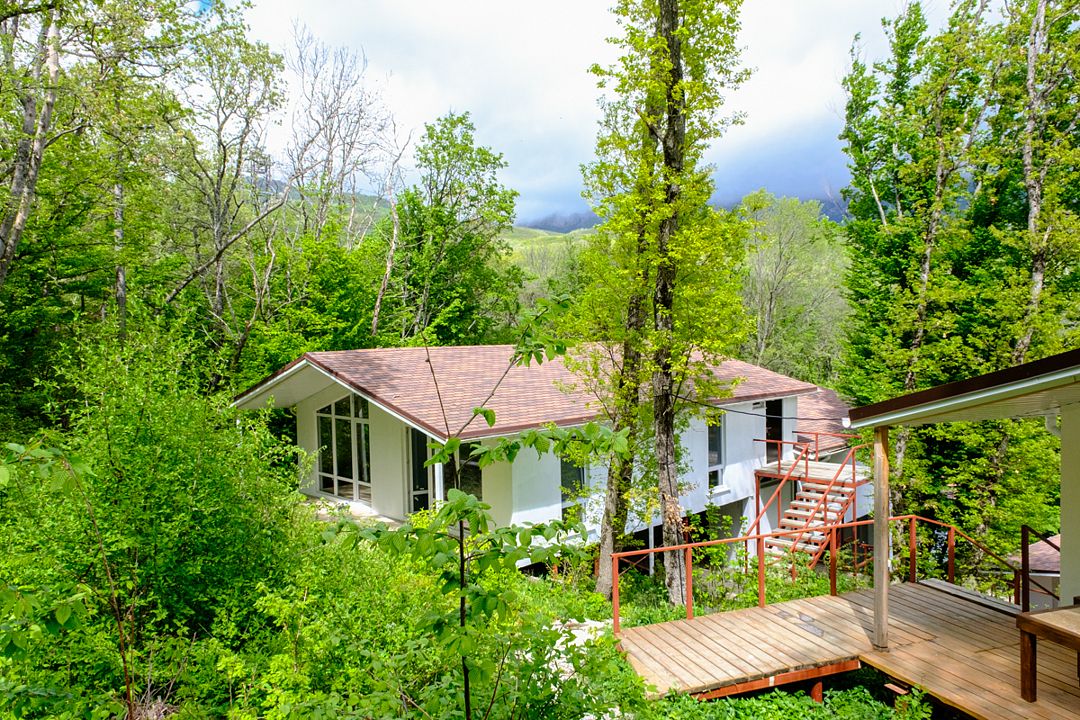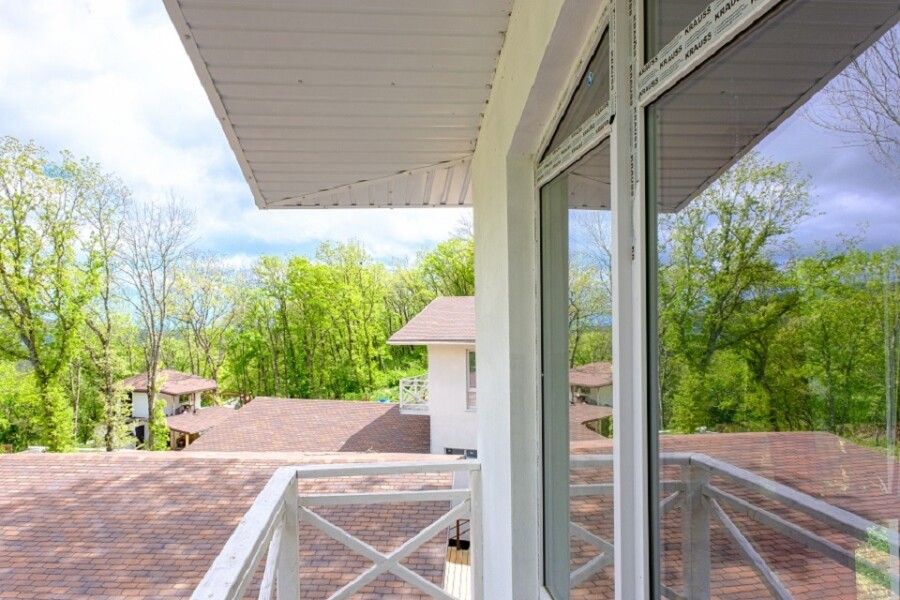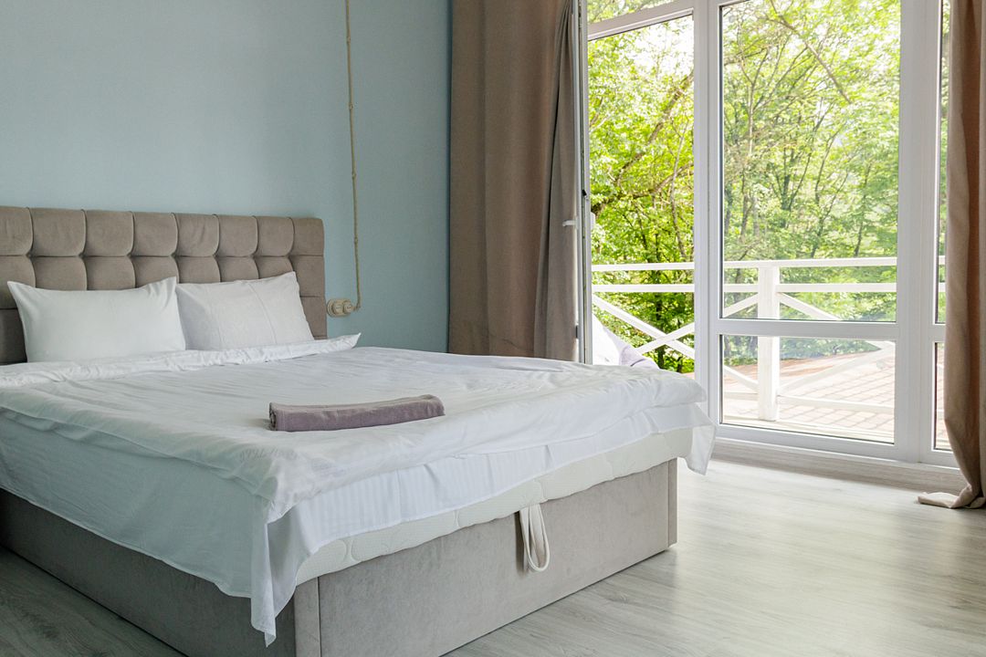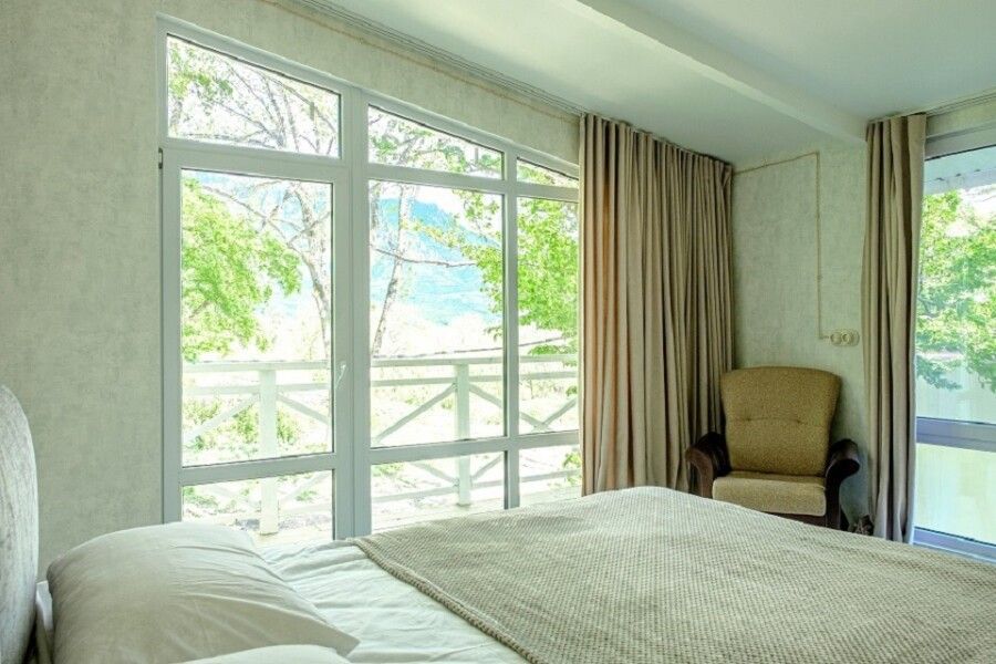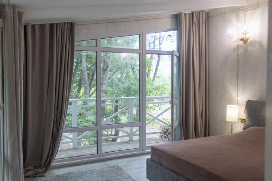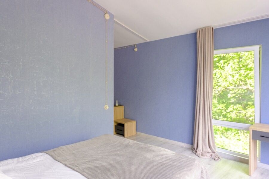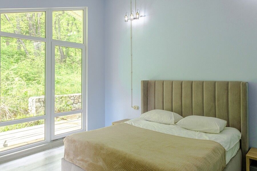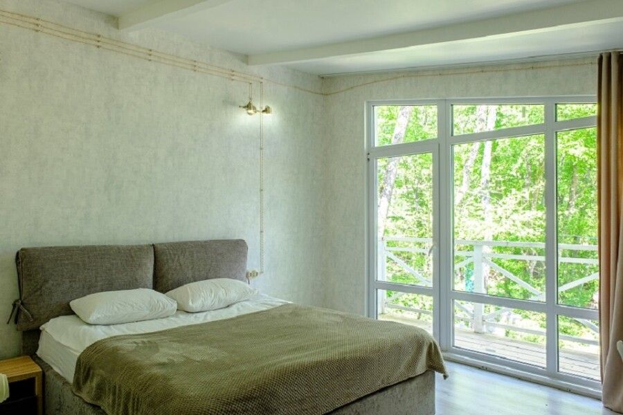 Двухкомнатный домик с отдельным входом идеально подойдет как для большой семьи до шести человек, так и для комфортабельного романтического отдыха парой. Спальня с панорамным окном и выходом на просторную террасу в гущу дубового леса.