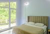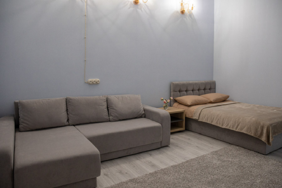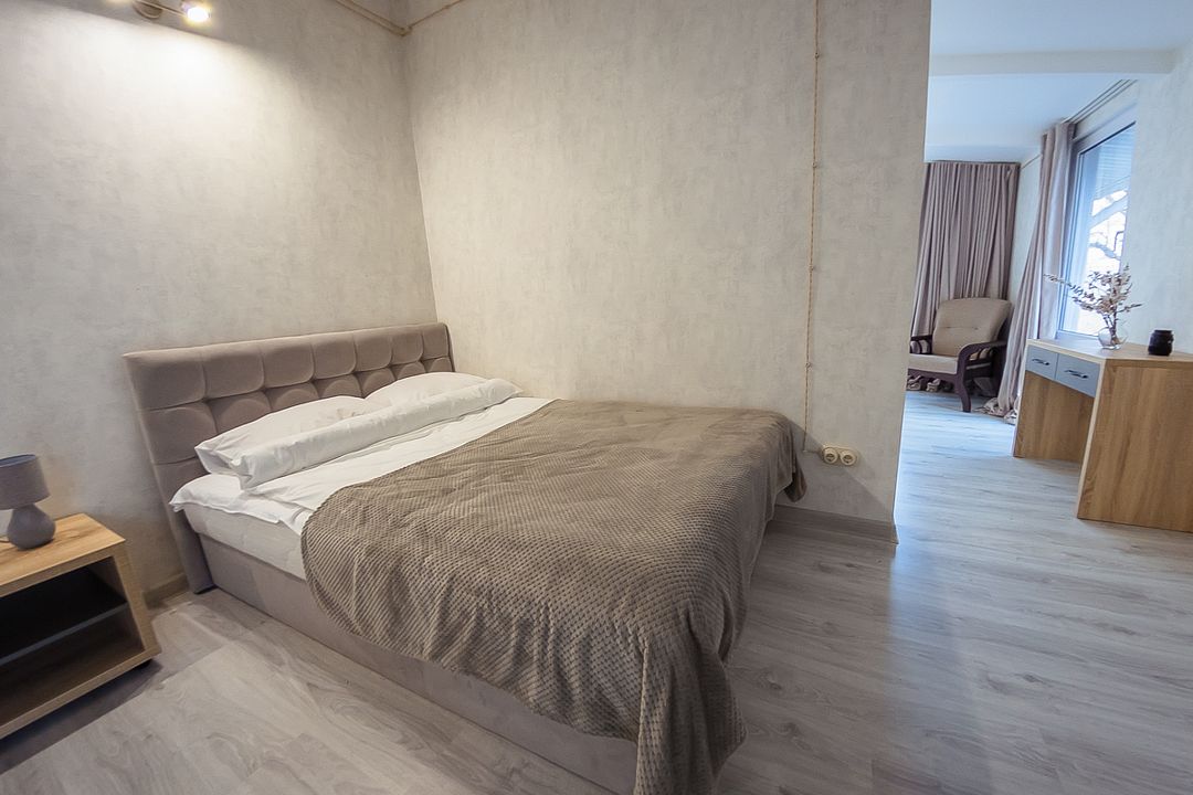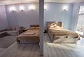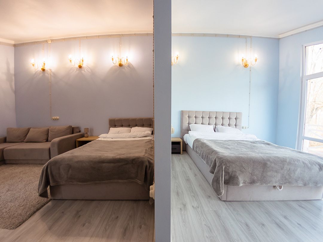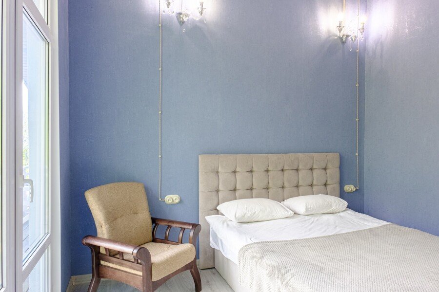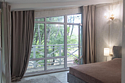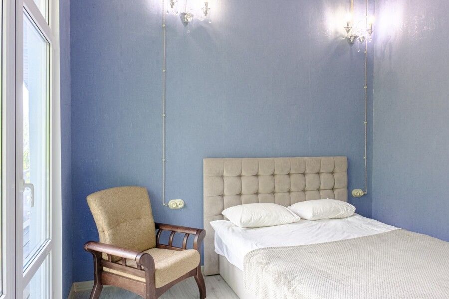 Первая комната с выходом на балкон 6 м², двуспальная кровать 160х200 см, кресло, прикроватная тумба и столик с выдвижными ящиками. Вторая комната с окном, двуспальная кровать 145х210 см, диван, столик с выдвижными ящиками.