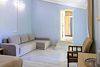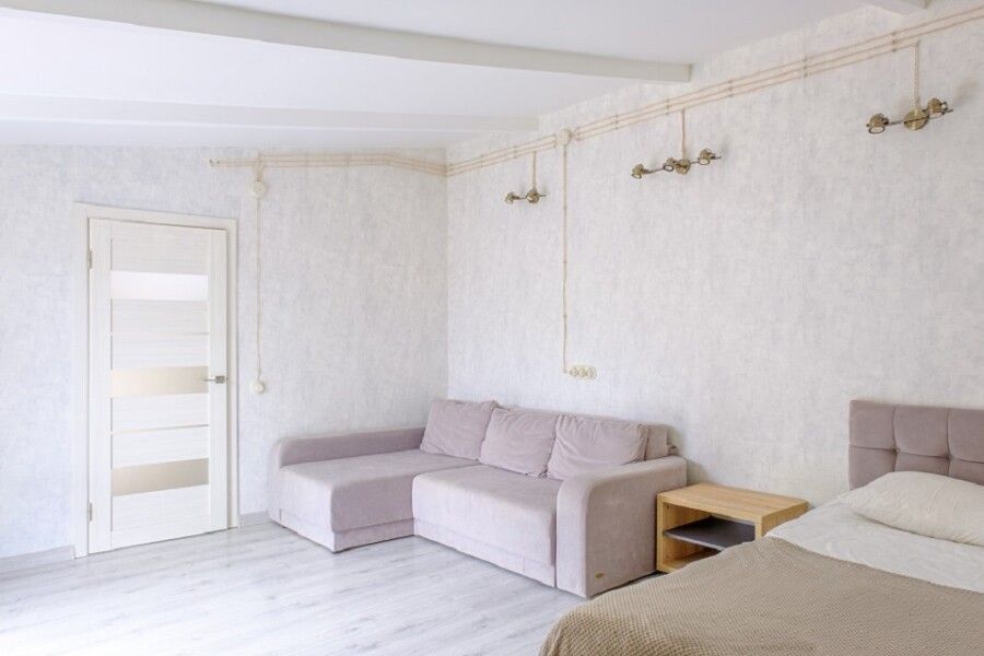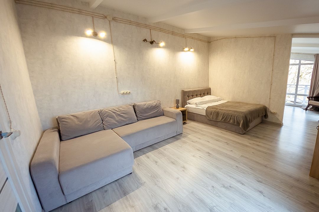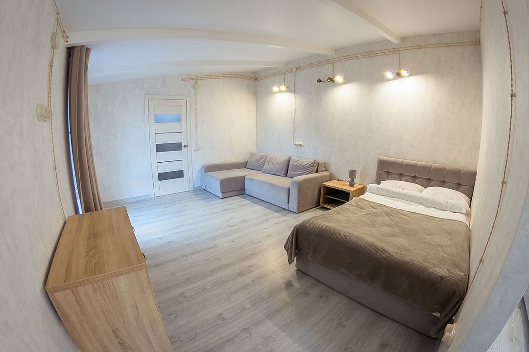 Спальня оснащена двуспальной кроватью 160х200 см, креслом, прикроватной тумбой и столиком с выдвижными ящиками. В гостиной окно, столик, диван-кровать и дополнительная двуспальная кровать 145х210 см.