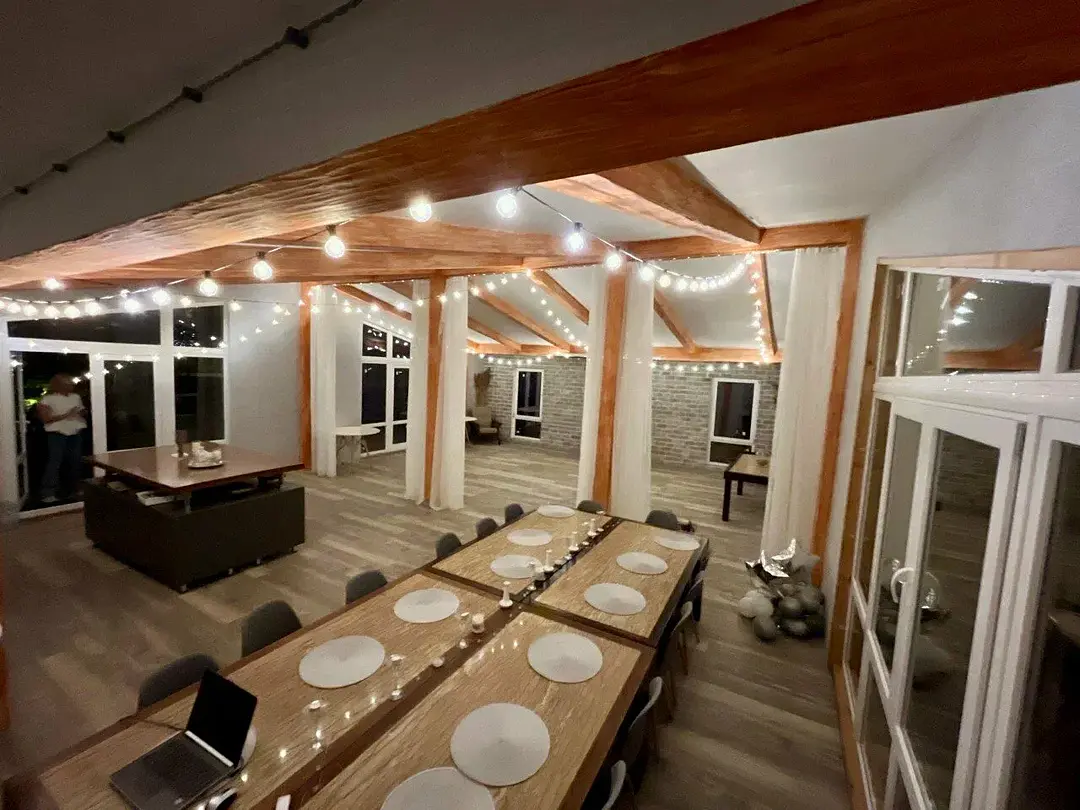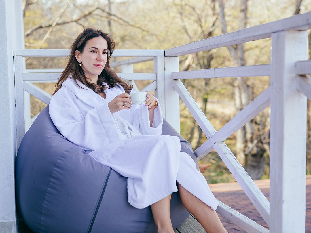 На террасе мягкое кресло-мешок, в котором можно уединиться с книжкой или провести медитацию на природе. Можно предоставить столик для отдыха с компанией.