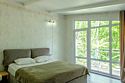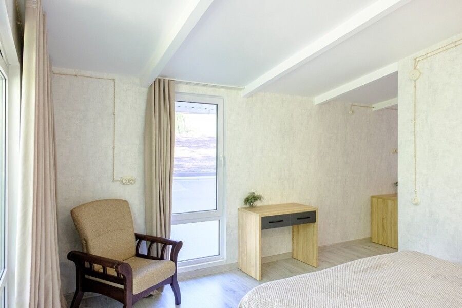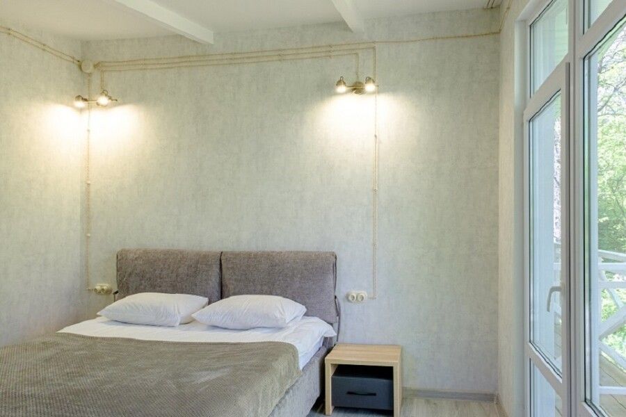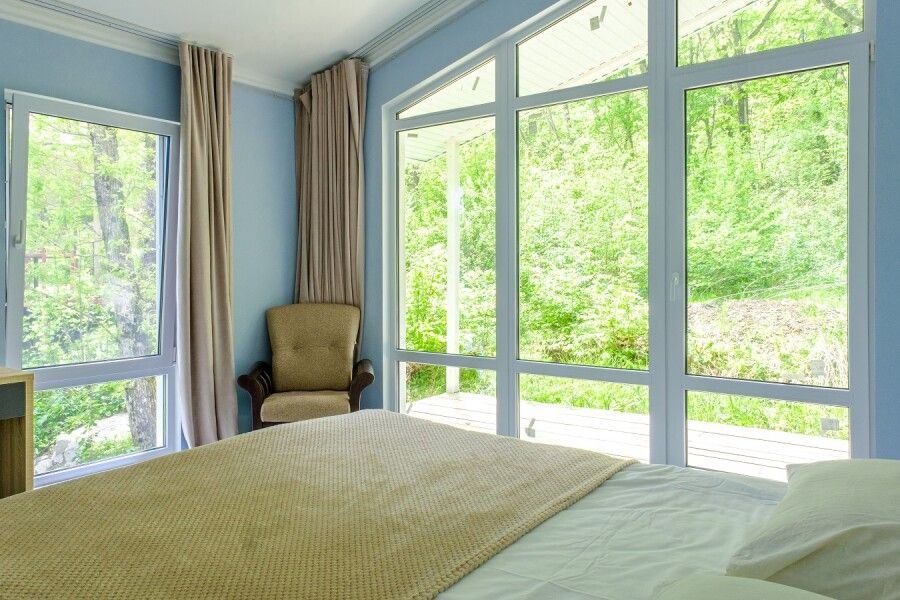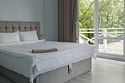 Двухкомнатный номер с панорамным окном в спальне и выходом на просторную террасу в гущу дубового леса подчеркнет уединенность Спальня оснащена двуспальной кроватью 160х200 см, креслом, прикроватной тумбой и столиком с выдвижными ящиками.