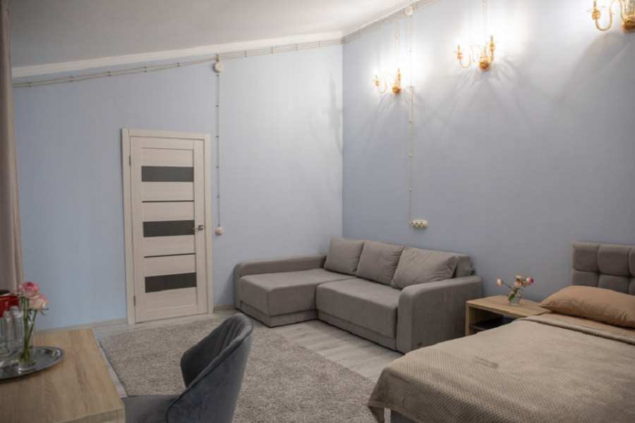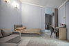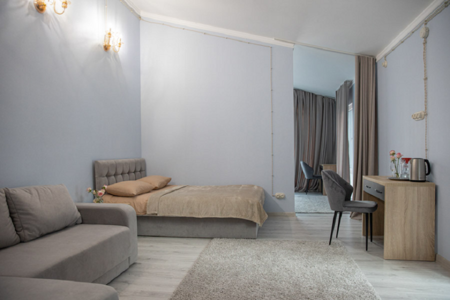 В гостиной окно, столик, диван и дополнительное спальное место. В номере большой шкаф с зеркалом в полный рост. Ванная комната оснащена душем. Фен в каждом номере.