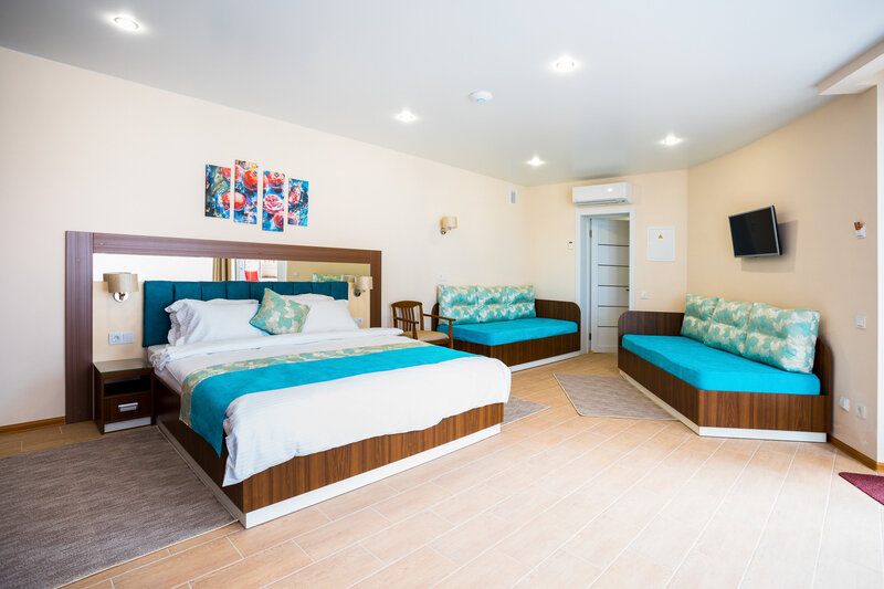 В номере 1 двуспальная кровать и 2 тахты (в которых используются полноценные ортопедические матрасы).