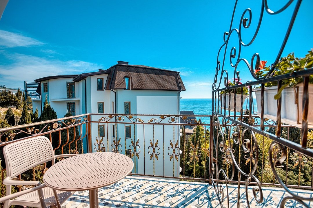 Номер с панорамным остеклением и большим балконом, с которого открывается частичный вид на море.