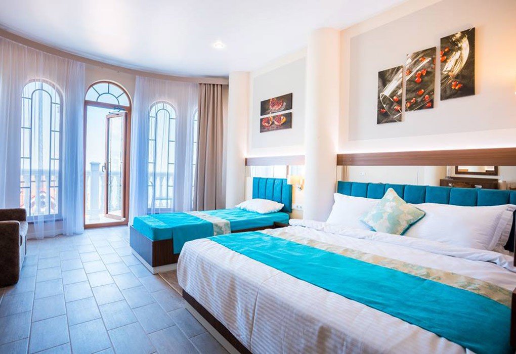 Путешествие с семьейПрекрасный отдых в КрымуМы отдыхали в "Гранатовом поместье" в Алуште 10 дней. Очень хороший отель. Мы лет 17 не отдыхали на курортах России, имеем обширный опыт того, что из себя представляет отличный отель (четырех и пятизвездочные отели в Греции, Испании, ОАЭ), поэтому были приятно удивлены достойным сервисом. У нас был номер «Стандарт +» в корпусе Б. Большая комната со всеми удобствами: есть микроволновая печь, набор посуды. Есть электрочайник, салфетки. В ванной комнате на каждого по 3 полотенца + полотенце для ног, выдают также пляжные полотенца. В ванной есть таз, удобно полоскать купальники. У нас был большей угловой балкон со столом и стульями и сушкой для белья. Питание мы брали полупансион. На завтрак всегда есть мюсли трех видов, молоко, йогурт, колбасная нарезка, свежие огурцы, помидоры, сыр, блюда из яиц чередуются (омлет, яичница, вареное). Чередуются также мясные блюда (сардельки, сосиски, куриный шашлычок, котлеты) и гарниры, есть тушеные овощи или овощи-гриль, джем, что-нибудь из фруктов, выпечка. Предлагают также молочную кашу. Все вкусно и сытно. На ужин сервировали порционные блюда (каждый день недели – свое меню): закуска, основное блюдо, десерт. Порции большие. Мы все не могли съесть, забирали с собой. Повар готовила и сервировала как в лучшем ресторане. Супер! В отеле есть SPA-зона с хамамом, соляной пещерой, джакузи, сауной и бассейном, над которым висят качели для классной фотосессии. Отдельную благодарность хотим передать управляющей Алиэ. Молодец. Большое спасибо!
