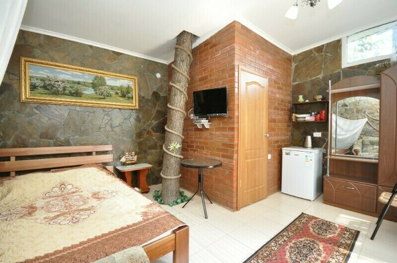 В номере растет настоящая сосна. Стены из природного крымского камня. Большие панорамные окна с видом на гору Кастель.