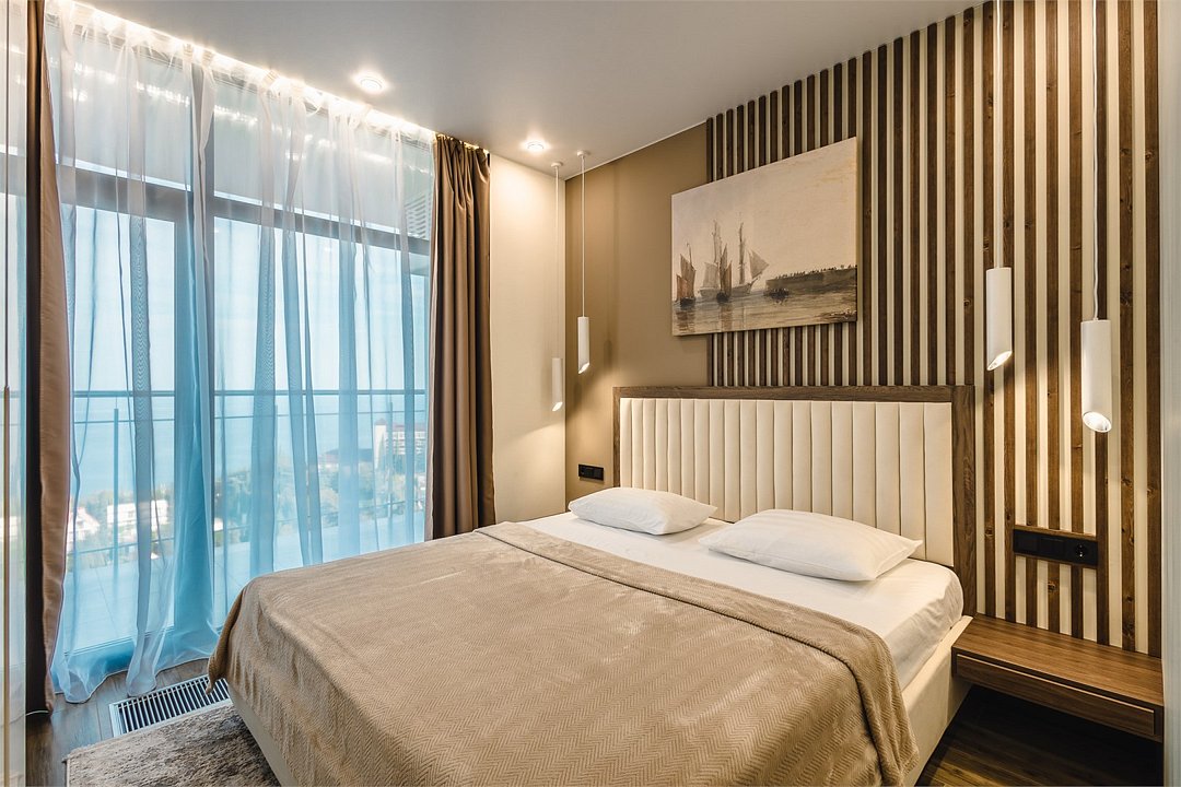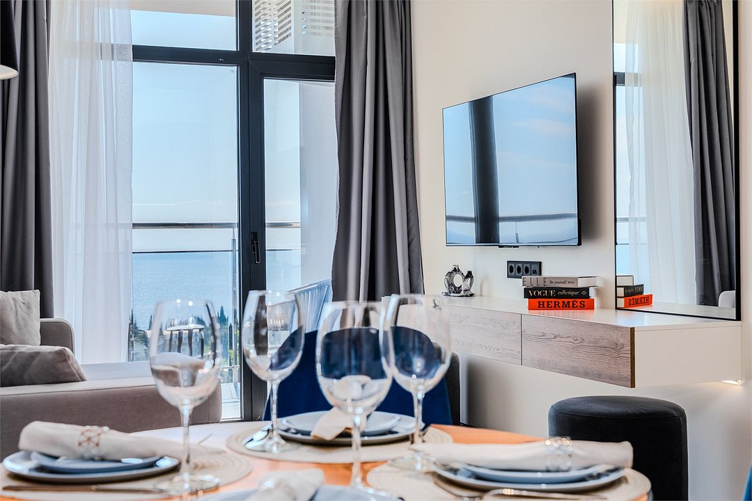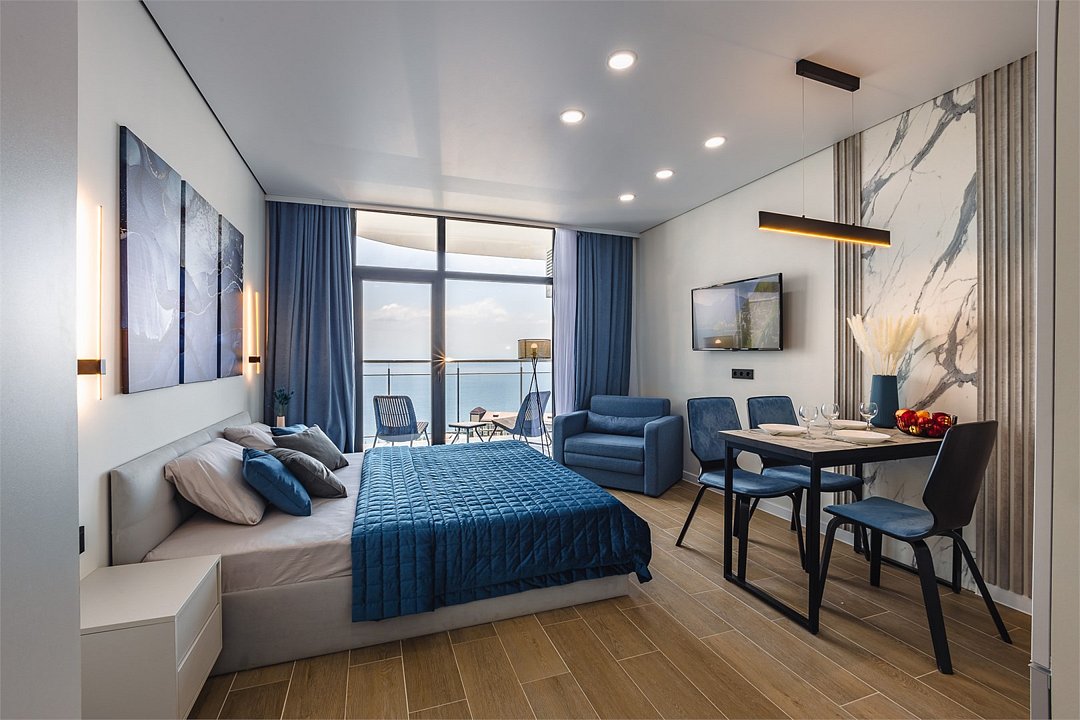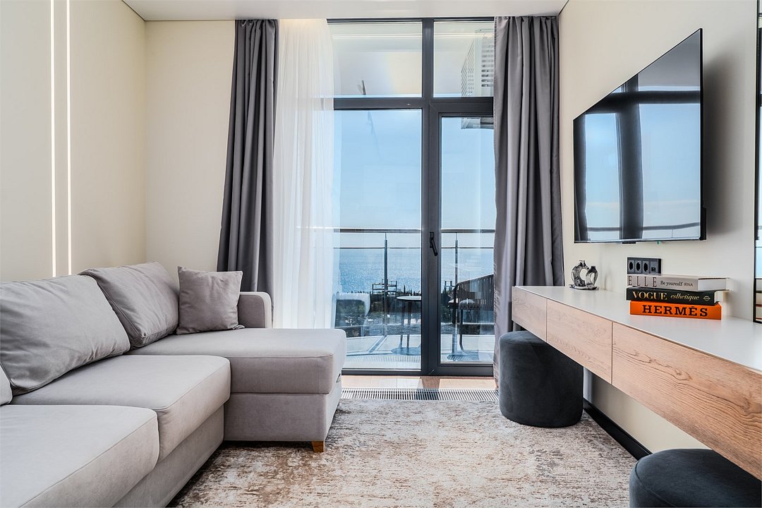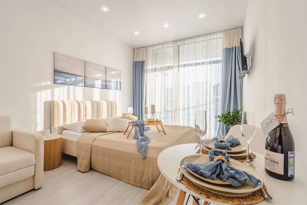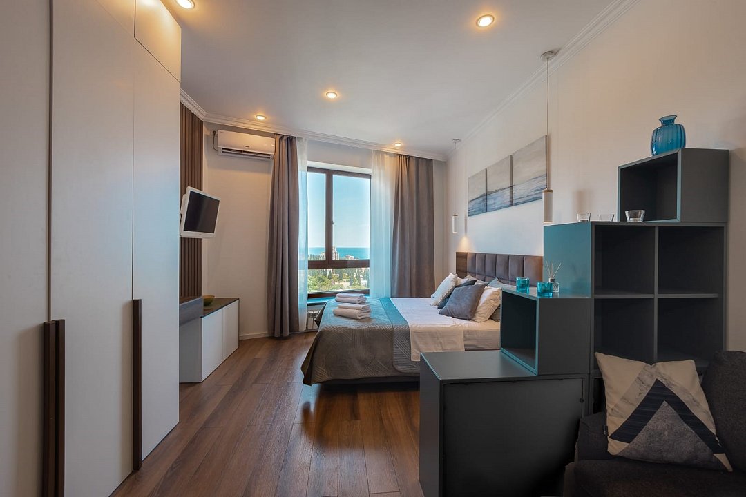 Wi-Fi, интернет, холодильник, кондиционер, фен, плита для приготовления пищи, микроволновая печь, утюг, душевая кабина, халаты, банные полотенца, тапочки, балкон, двуспальная кровать, гладильная доска, шкаф для одежды, гардеробная, обеденный стол, посудомоечная машина, стиральная машина, чайник, мягкая мебель, вид на море, кухонная посуда, стаканы, столовые приборы, туалет, панорамные окна, сушилка для белья, диван-кровать, шкаф-купе, гостиничная парфюмерия, телевизор со Smart TV, рабочий стол, вешалки-плечики, затемняющая штора, зеркало в полный рост, без питомцевВ апартаментах