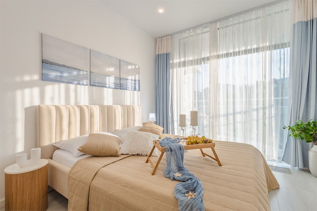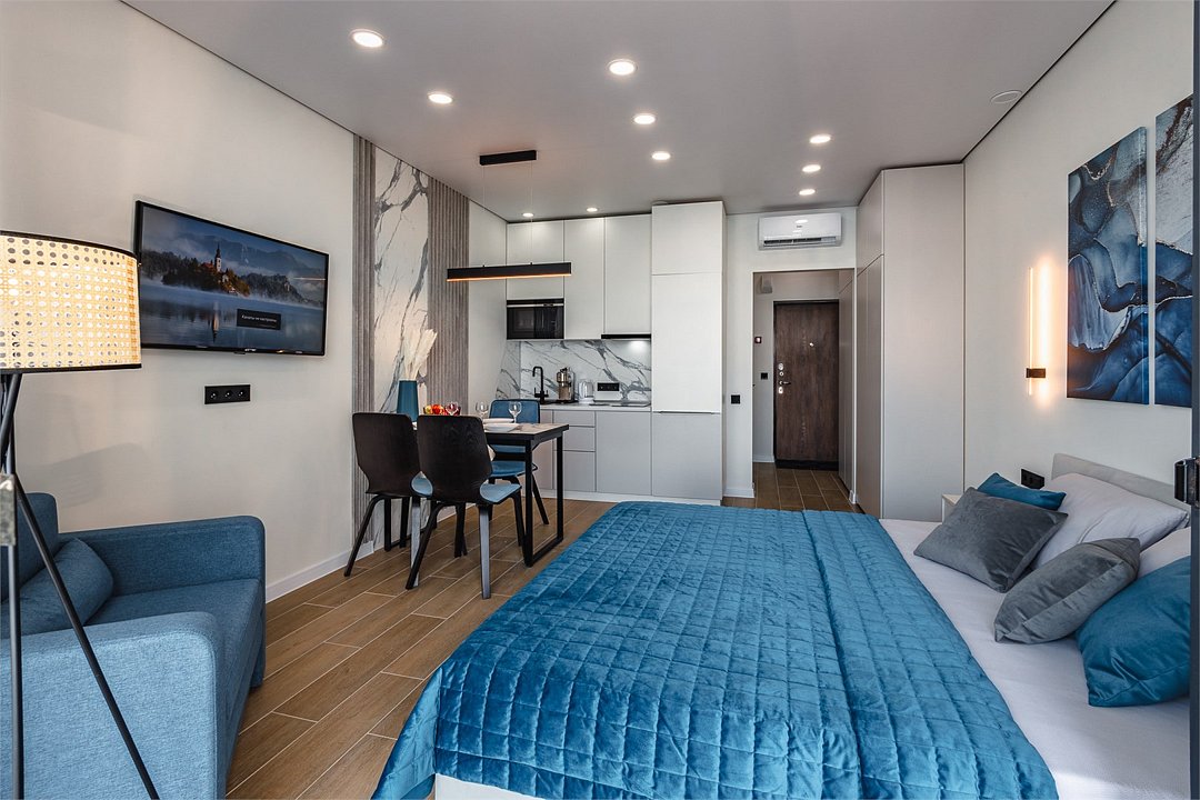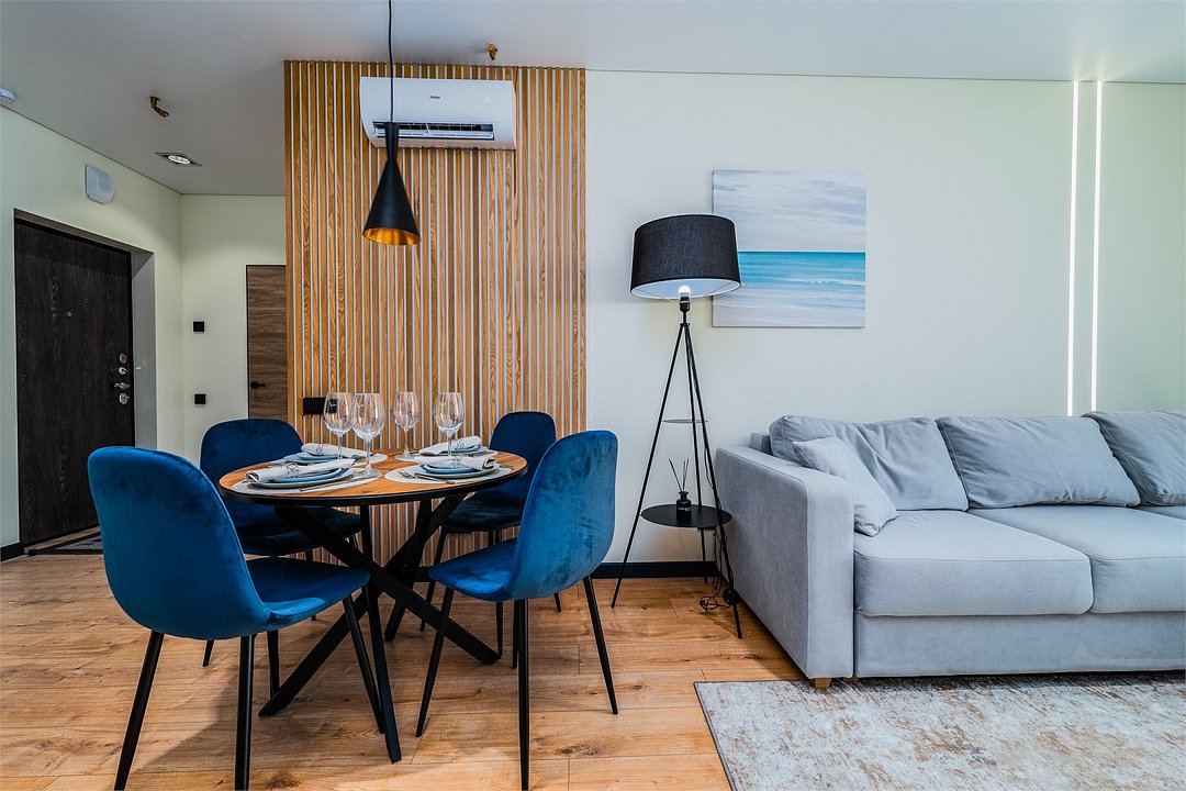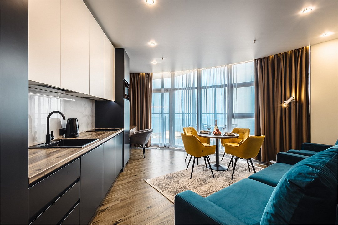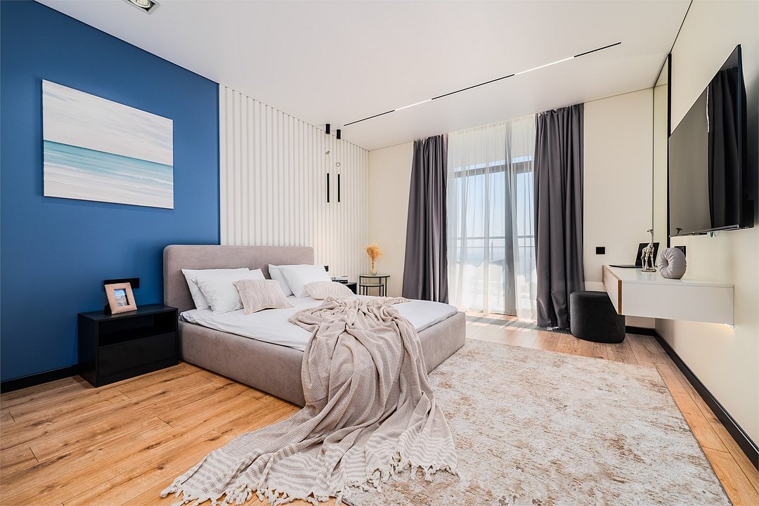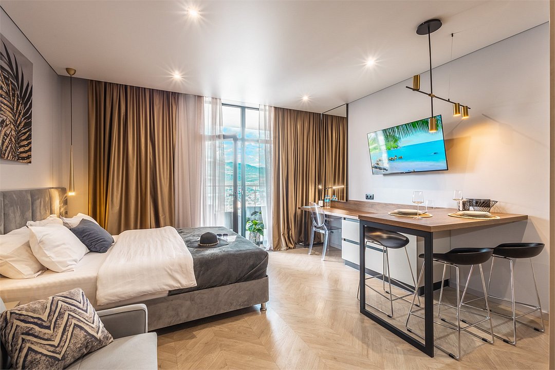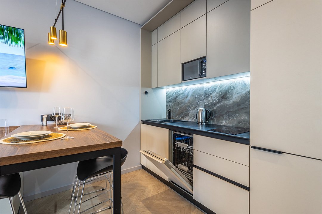 Wi-Fi, интернет, холодильник, кондиционер, фен, плита для приготовления пищи, микроволновая печь, утюг, душевая кабина, халаты, банные полотенца, тапочки, балкон, двуспальная кровать, гладильная доска, шкаф для одежды, гардеробная, обеденный стол, посудомоечная машина, стиральная машина, чайник, мягкая мебель, вид на море, кухонная посуда, стаканы, столовые приборы, туалет, панорамные окна, сушилка для белья, диван-кровать, шкаф-купе, гостиничная парфюмерия, телевизор со Smart TV, рабочий стол, вешалки-плечики, затемняющая штора, зеркало в полный рост, без питомцевВ апартаментах