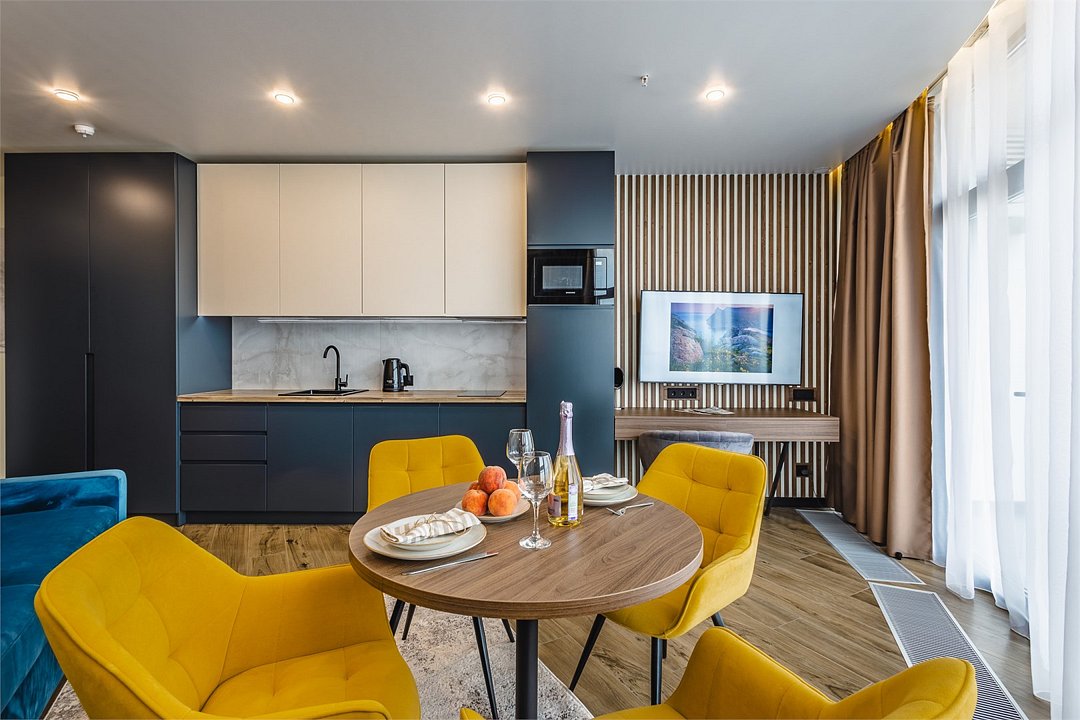 Wi-Fi, холодильник, кондиционер, фен, микроволновая печь, утюг, душевая кабина, санузел, халаты, банные полотенца, тапочки, балкон, балкон с красивым видом, двуспальная кровать, гладильная доска, шкаф для одежды, обеденный стол, зеркало, кухня, набор посуды, стиральная машина, чайник, обеденная зона, вид на город, кухонная посуда, стаканы, кухонная утварь, столовые приборы, туалетный столик, туалет, сушилка для белья, раскладное кресло, мини-кухня, шкаф-купе, гостиничная парфюмерия, вид на горы, телевизор со Smart TV, кресло-кровать, без питомцевВ апартаментах