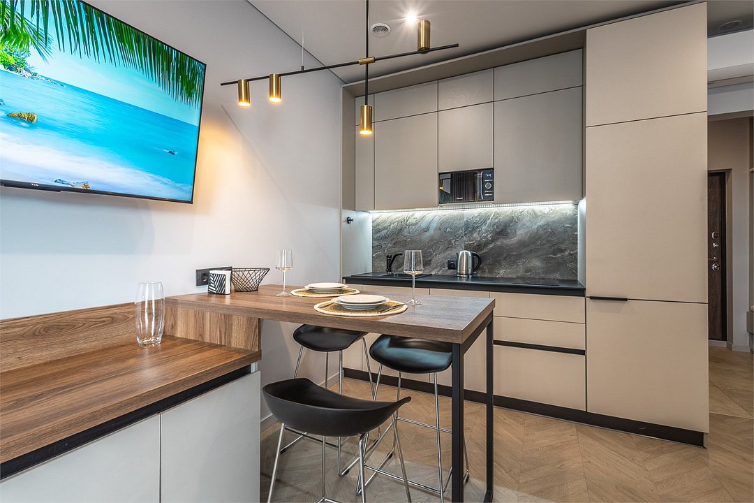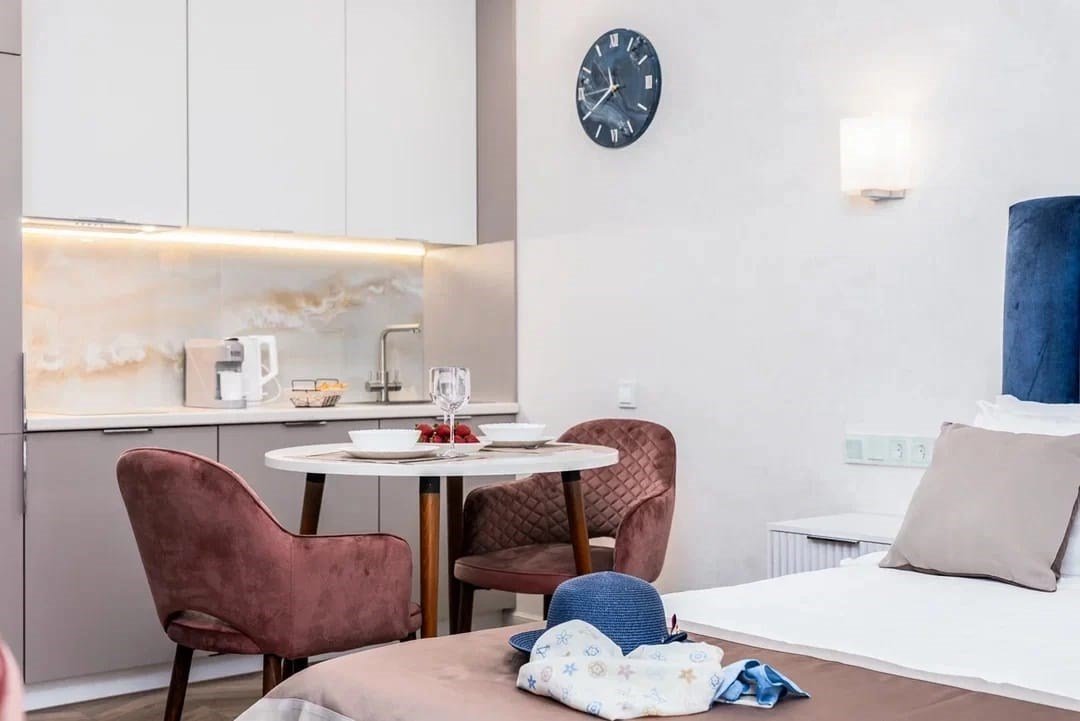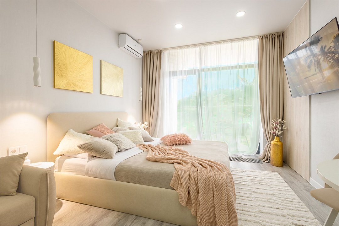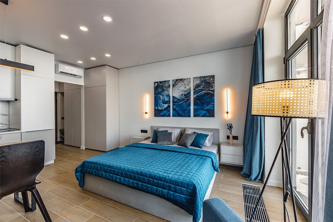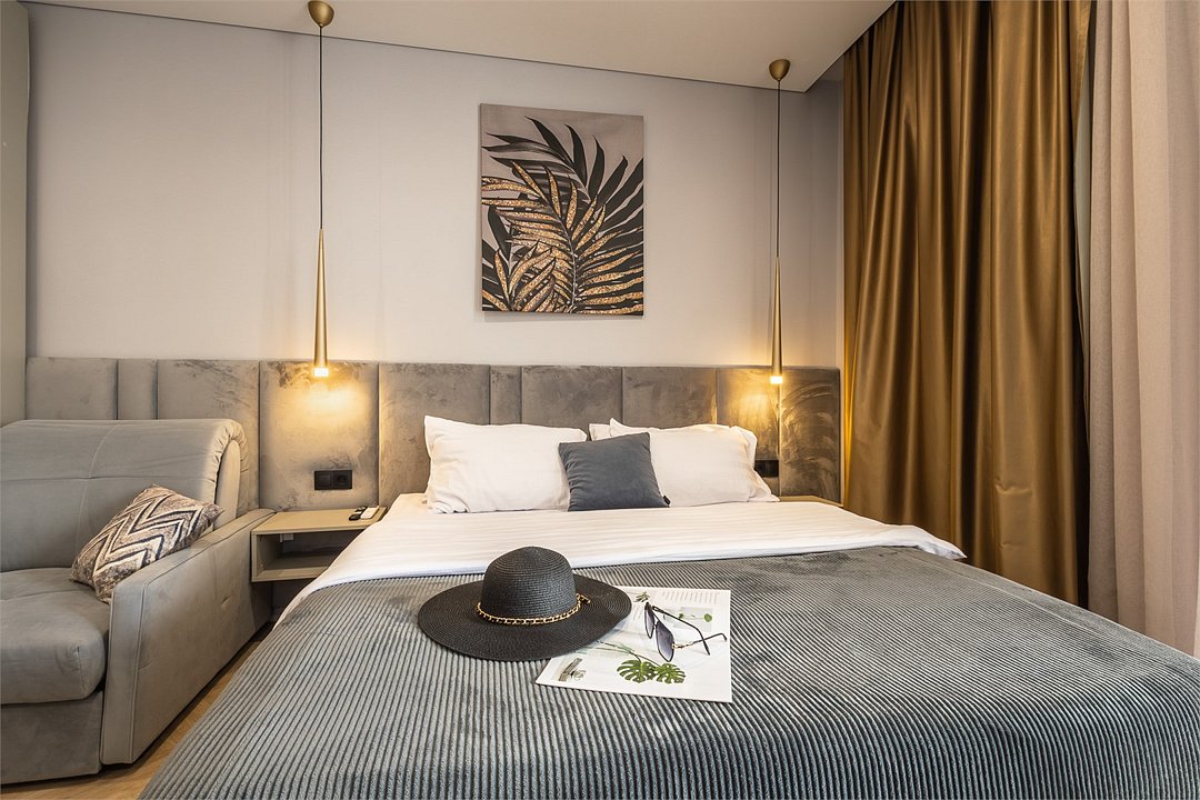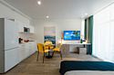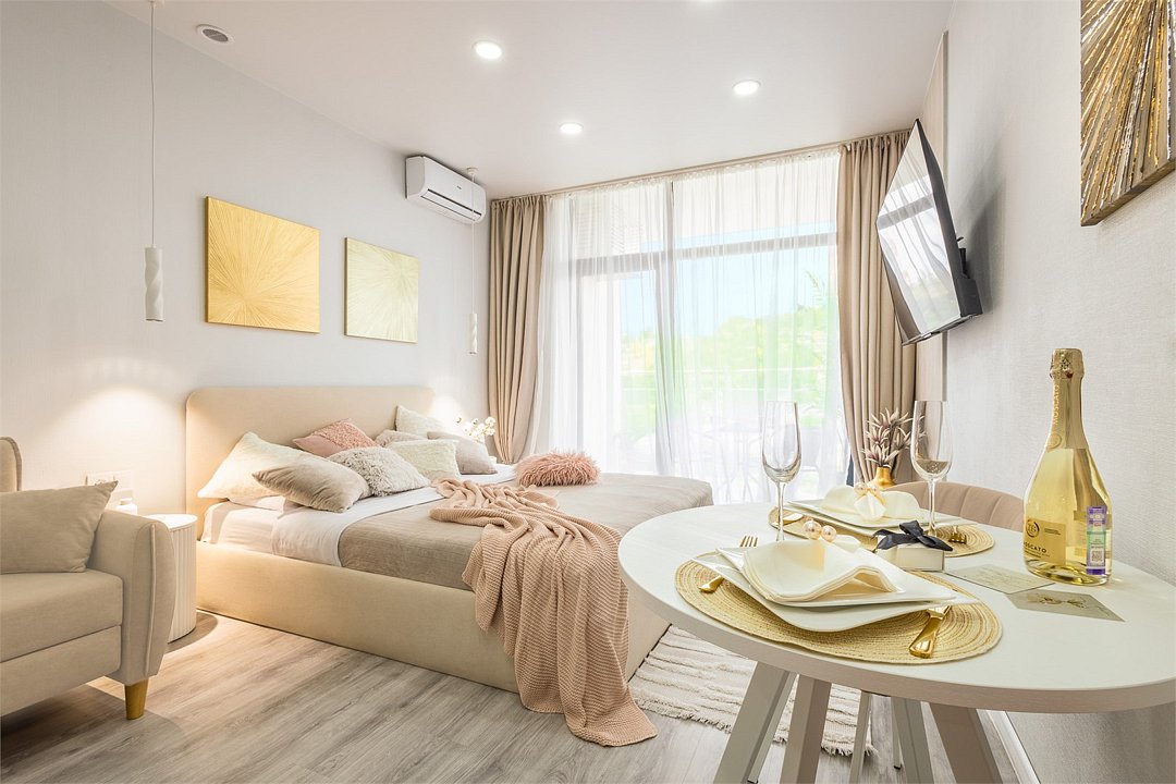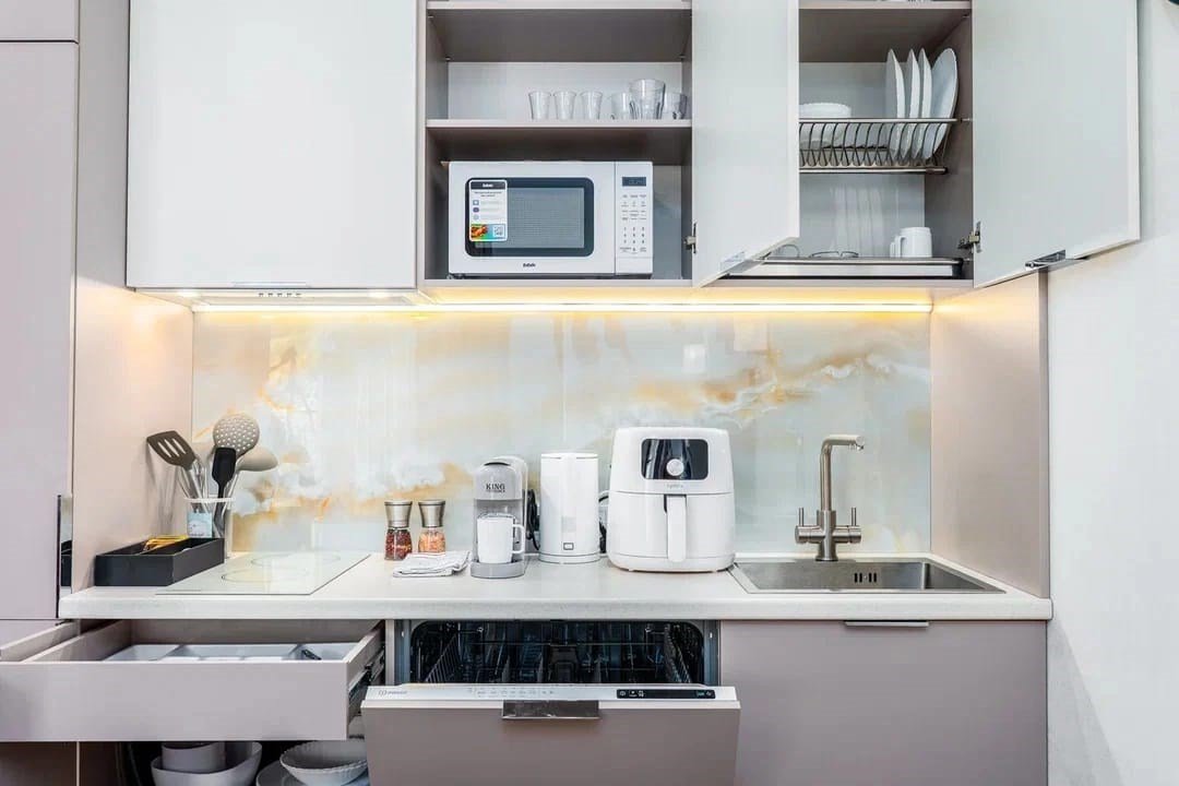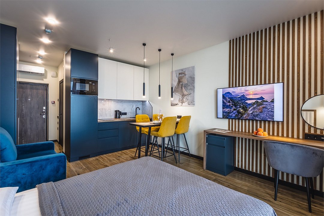 Wi-Fi, холодильник, кондиционер, фен, плита для приготовления пищи, кофемашина, микроволновая печь, утюг, душевая кабина, халаты, банные полотенца, тапочки, двуспальная кровать, гладильная доска, шкаф для одежды, обеденный стол, кухня, чайный набор, набор посуды, стиральная машина, чайник, обеденная зона, вид на море, кухонная посуда, стаканы, столовые приборы, туалет, раскладное кресло, гостиничная парфюмерия, телевизор со Smart TV, кресло-кровать, вешалки-плечики, затемняющая штора, зеркало в полный рост, без питомцевВ апартаментах