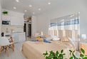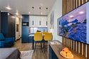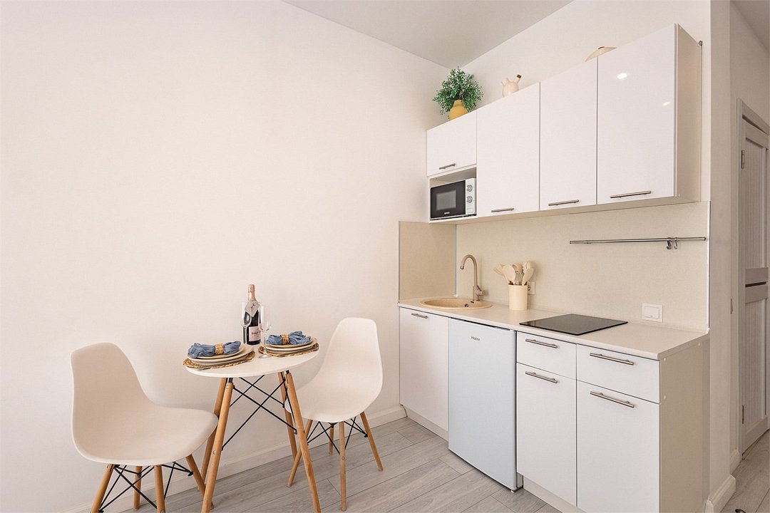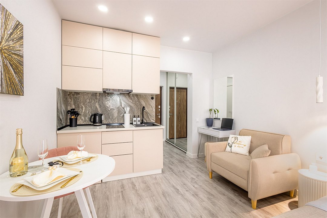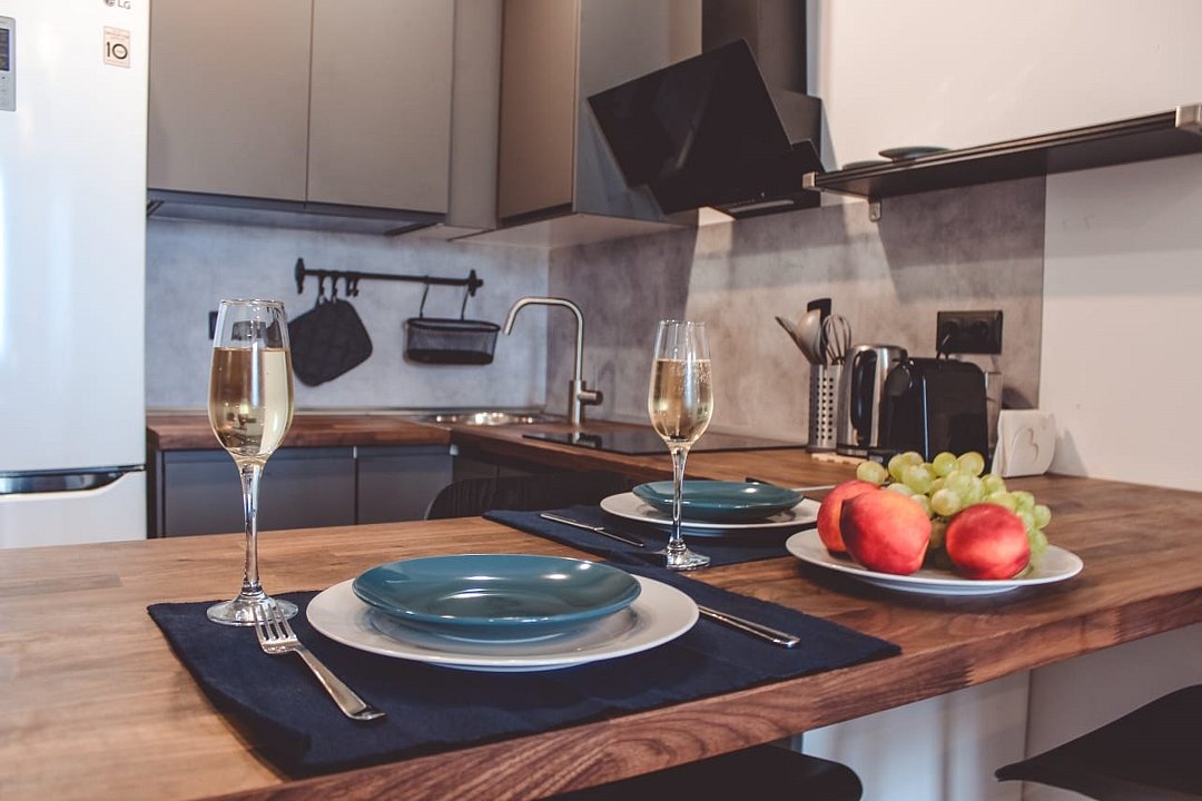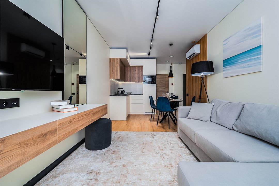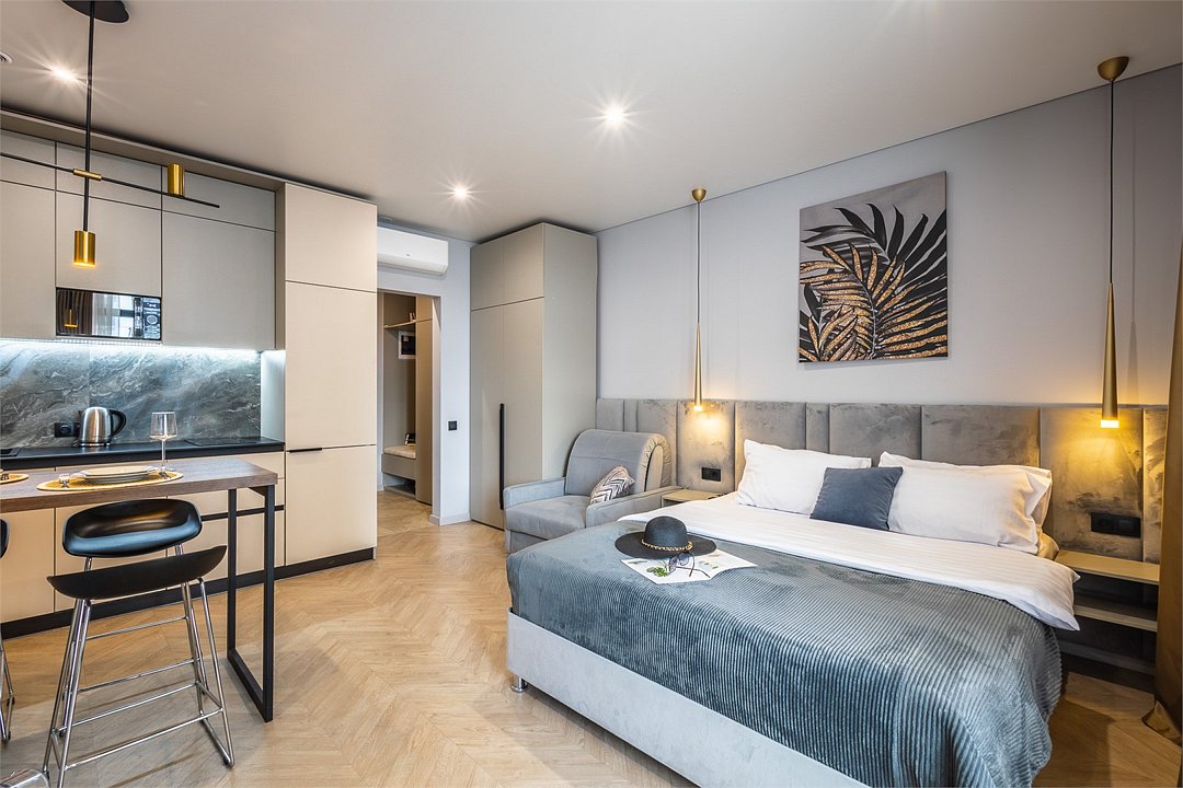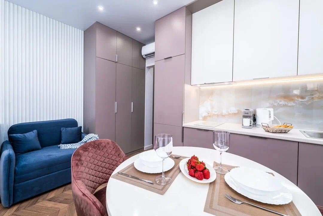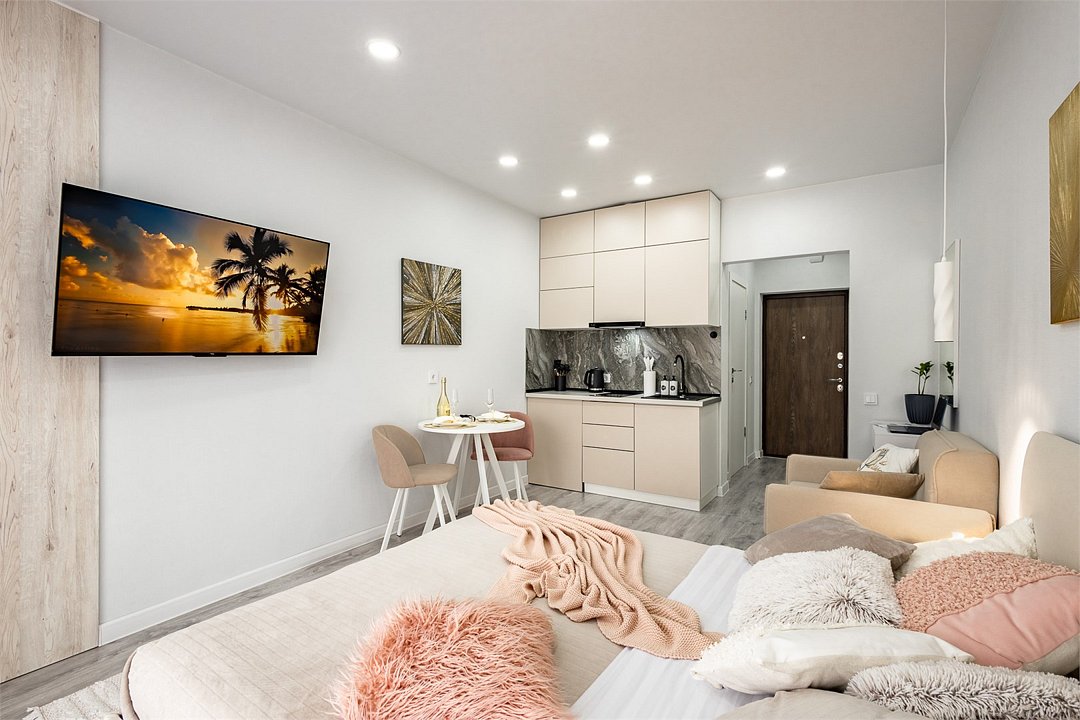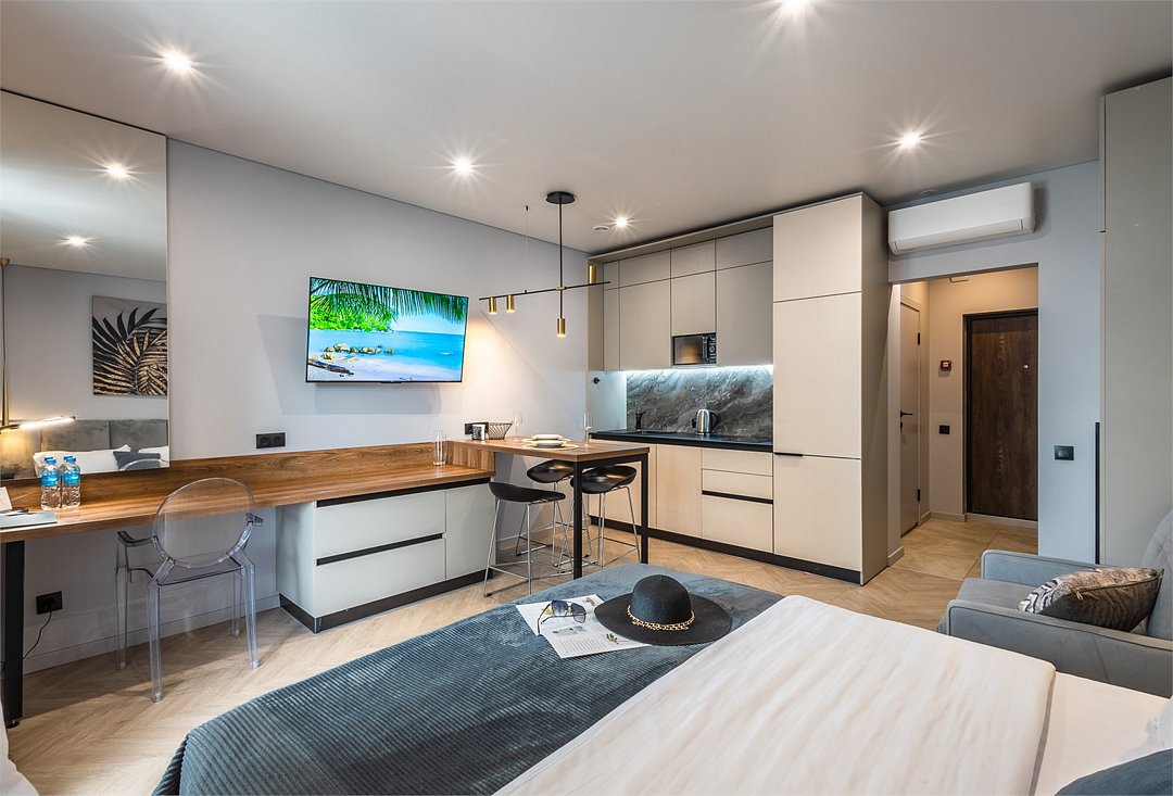 Wi-Fi, холодильник, кондиционер, фен, плита для приготовления пищи, кофемашина, микроволновая печь, утюг, душевая кабина, халаты, банные полотенца, тапочки, двуспальная кровать, гладильная доска, шкаф для одежды, обеденный стол, кухня, чайный набор, набор посуды, стиральная машина, чайник, обеденная зона, вид на море, кухонная посуда, стаканы, столовые приборы, туалет, раскладное кресло, гостиничная парфюмерия, телевизор со Smart TV, кресло-кровать, вешалки-плечики, затемняющая штора, зеркало в полный рост, без питомцевВ апартаментах