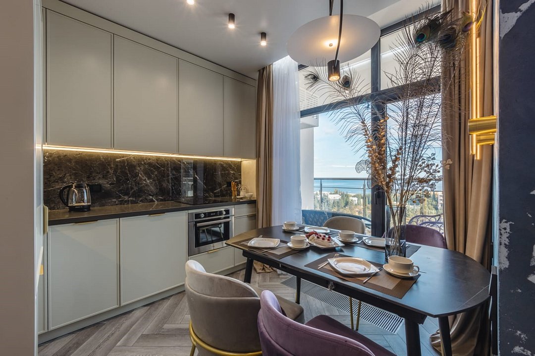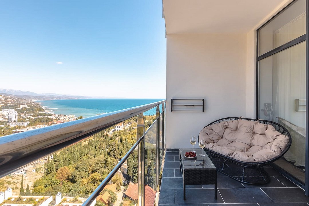 Апартамент находятся на 11-м этаже нового ЖК "Солярис" в городе Ялта, по адресу ул. Ломоносова, д. 25. Из окон открывается великолепный вид на море. Комплекс расположен на закрытой и ухоженной территории, где имеется детская площадка и и парковка для автомобилей. Всего в 100 метрах от дома находится Пионерский парк, стадион "Авангард" и остановка загородных автобусов, которые могут доставить вас в такие популярные места, как Массандра, Ай-Петри, Никитский Ботанический сад и Ливадийский дворец. Также в непосредственной близости от дома расположены магазины продуктов, аптека, пекарня, рынок, салоны красоты, рестораны и кафе. Вам не придется далеко ходить, чтобы удовлетворить свои потребности. Всего в 10 минутах ходьбы через парк находится лучший пляж Ялты - "Приморский пляж". Он отличается широкой береговой линией, деревянными настилами и всей необходимой пляжной инфраструктурой для комфортного отдыха. Вы также можете легко дойти до центральной набережной всего за 10 минут, пройдя по маршруту без крутых подъемов или спусков. В апартаменте есть полностью оборудованная кухня с посудомоечной машиной, где вы можете приготовить вкусный обед. Также предоставляются кабельное телевидение и WiFi для вашего удобства. Номер имеют хорошую звукоизоляцию, чтобы обеспечить вам спокойный отдых. Для комфортного сна в есть огромная кровать king-size с белоснежным постельным бельем. Если вы путешествуете с детьми или друзьями, у нас имеется раскладной диван-кровать. Апартаменты идеально подходят для пар и семей с одним или двумя детьми. Мы предлагаем детскую кроватку и стульчик для кормления, чтобы обеспечить комфорт вашим малышам. В ванной комнате вы найдете свежие полотенца, фен и стиральную машину. Также в вашем распоряжении есть сушилка для белья, гладильная доска, утюг, сейф, халаты и тапочки. Мы постарались предусмотреть все необходимое для вашего удобства. Так что, если вы ищете уютные апартаменты с прекрасным видом на море, удобным расположением и всеми удобствами для комфортного проживания, то наши апартаменты в ЖК "Солярис" - идеальный выбор для вас и вашей семьи!Услуги и удобства
