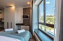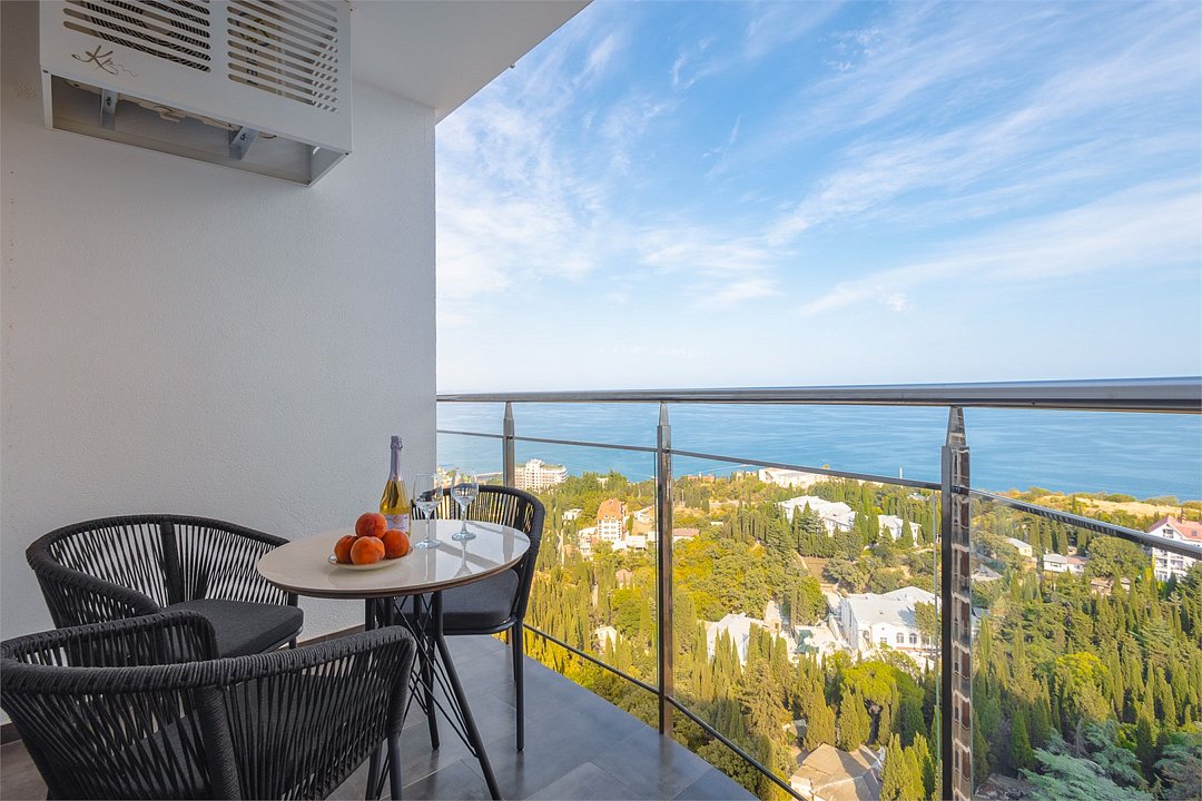 Апартаменты-студия площадью 33 м2 на 14 этаже. Расположенные по адресу: г. Алушта, ул. Западная, д.4, они обладают прекрасным видом на море , которым можно наслаждаться, расслабившись на уютном балконе. Основное спальное место представлено двуспальной кроватью. Также в апартаментах имеется кресло-кровать, что позволяет разместить до 3 гостей без каких-либо неудобств.Услуги и удобства